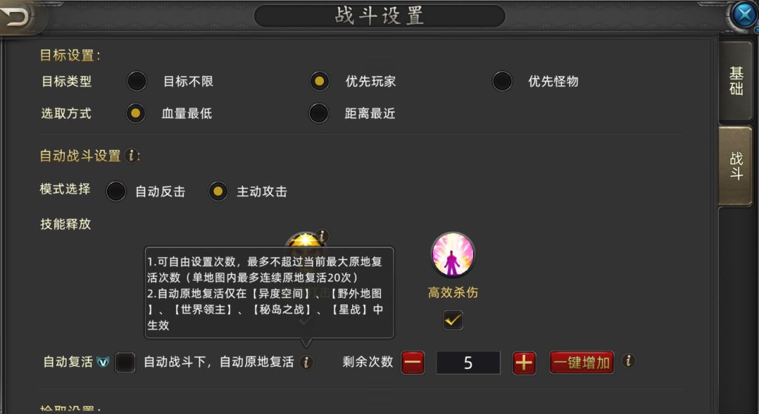 最后就是自动复活,自动复活勾选了,就算你被人打死了,你也会满血复活,打世界领主、或者在野外挂机的时候,必须点上,不然你忙完事情回来发现自己在太阳城晒了很久太阳了。