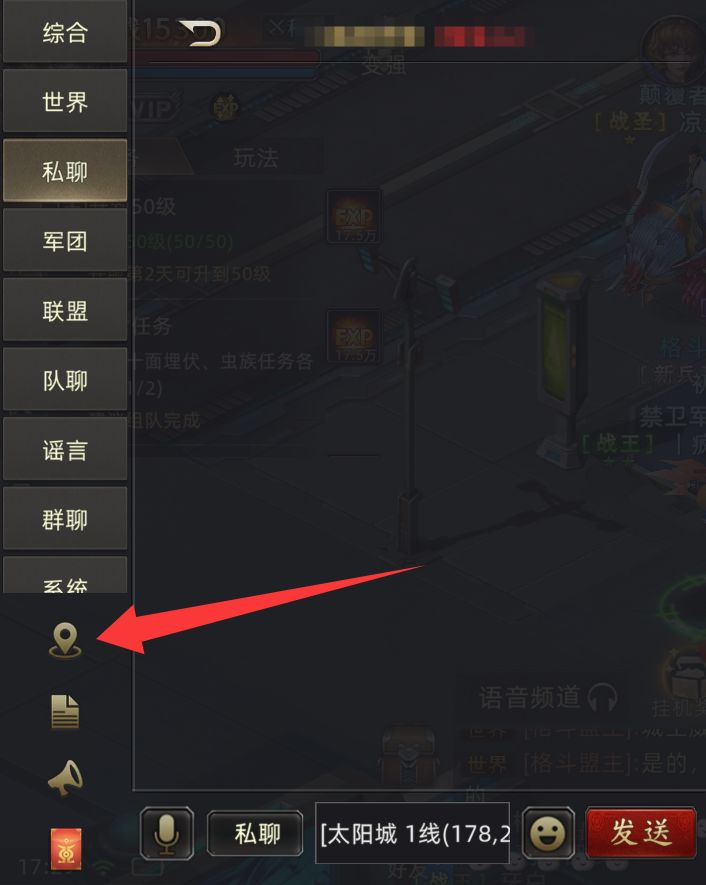 发送坐标:如果想让你朋友过来,或者你被人打了,点击聊天框旁边【坐标】,就能一键把你的位置发到军团、好友或者世界频道。兄弟们一点就能飞过来,方便得很。