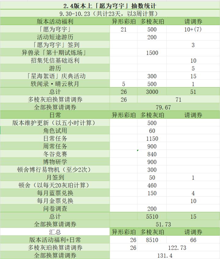 物华弥新2.4版本上『愿为穹宇』抽数统计