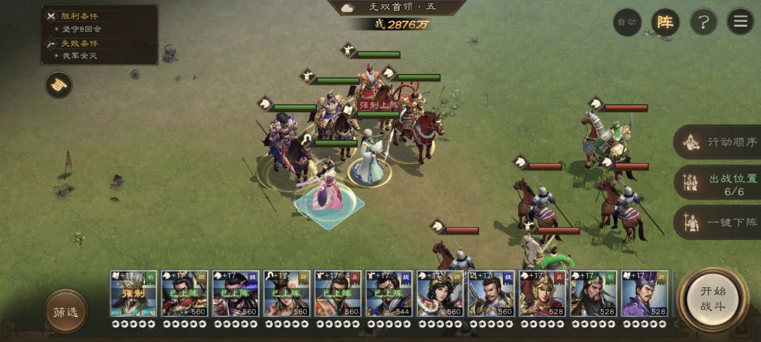 阵容推荐:核心输出夏侯惇,夏侯惇可以一个人去下路单挑所有骑兵,大家都是轻骑兵,而夏侯惇攻高能吸血,基本上一枪一个,貂蝉负责给最强者加攻,顺便奶几回合清一下张飞混乱,辅助曹操孙权,孙权非常肉同时还有群体加防减爆伤,曹操天赋加攻死了也能生效,然后旁边那个吕布不重要,没啥用