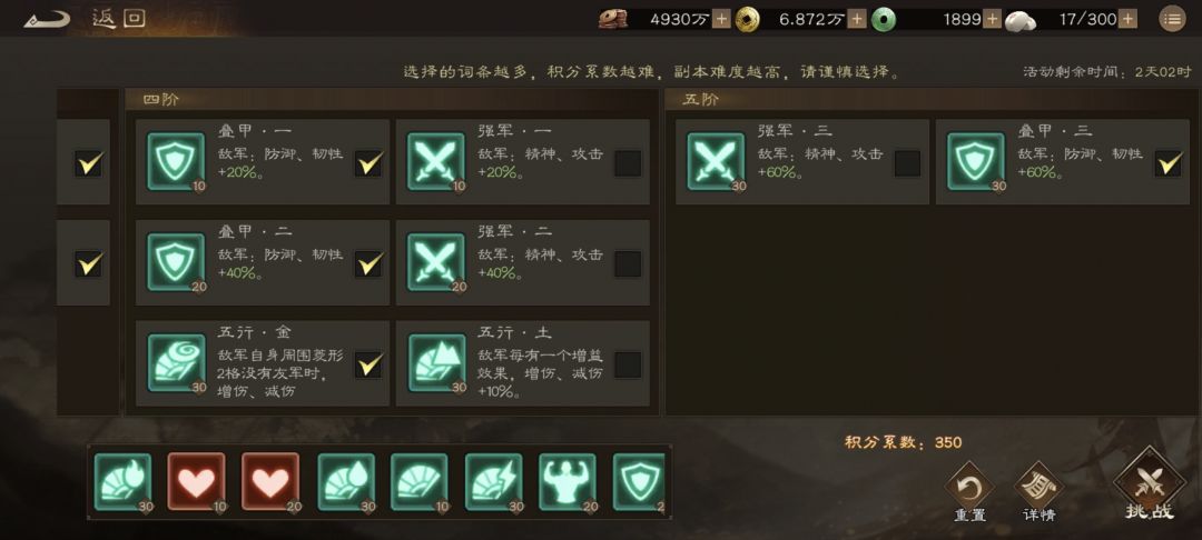 想要打高分其实很简单,首先就是buff选择,一定要把五行土给去掉,否则敌军无限buff根本打不动,然后就是3层攻击,根据自身练度可酌情去除,只要关羽不能秒人,那就一切好说了
