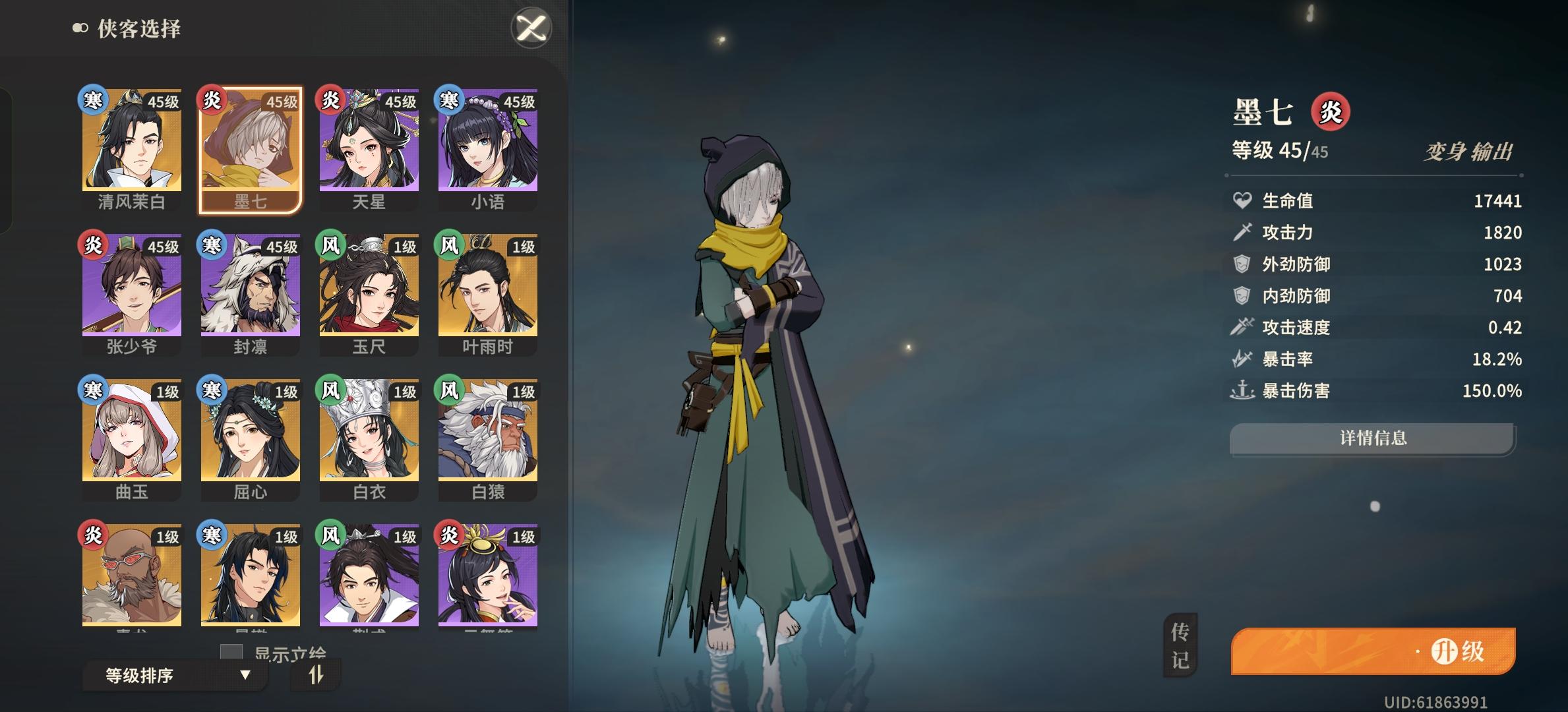 👿墨七因为独特的10费大招机制,又没有什么契合的队友和心法,要么牺牲策略卡带召唤物,要么带策略卡让墨七放不出大招。基本队里用不了其他前排(墨七自动模式会用5费大招跳到人堆里被敌人围殴死,带叶雨时这种根本没怒气开大,所以放弃了)只能木人嘲讽+狼叔在前排扔狼承伤。小语基本上也是绑定在队里的了,因为墨七的伤害太低了,需要她当30%的单体破防技能。张少爷虽然是辅c,但是承担队里70%的输出(为什么不用玉尺?因为墨七开大献祭玉尺的召唤物,玉尺输出还不如1个怒气召唤两个松鼠用处大)