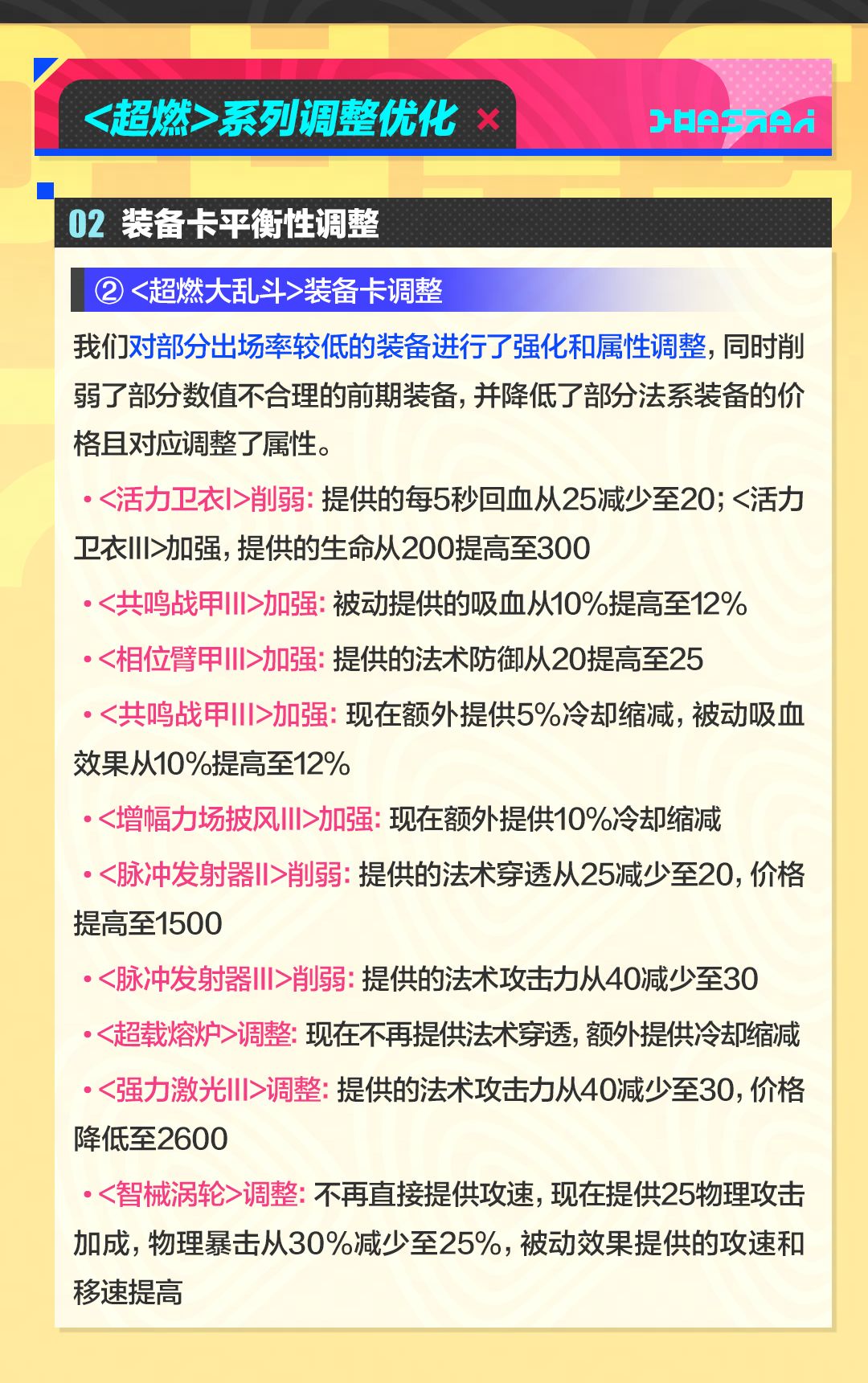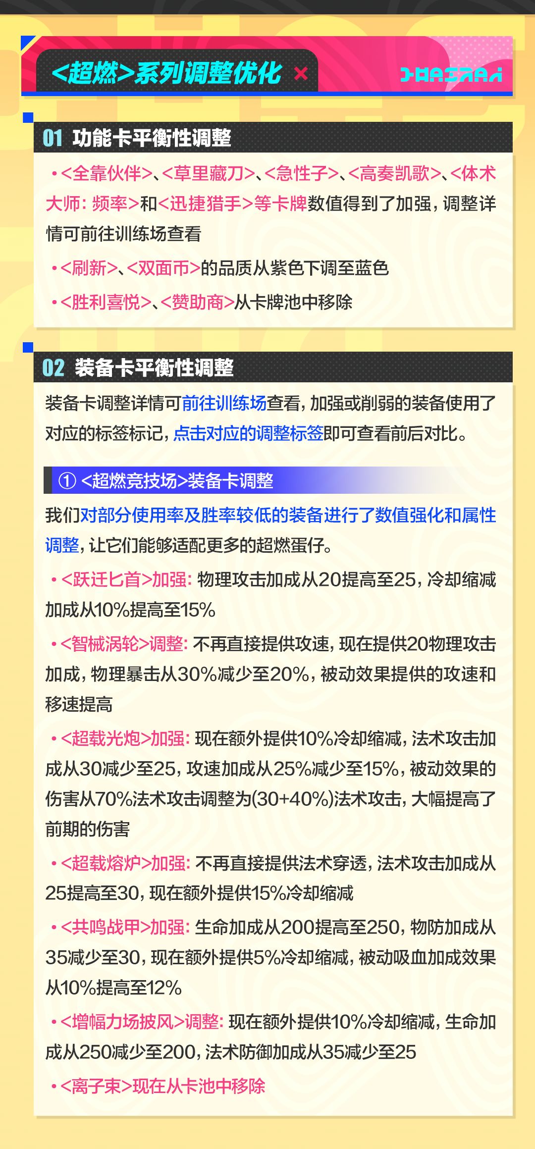 9月25日(本周四)0点,多张功能卡与装备卡的数值与属性等进行优化调整。具体详情可届时前往【超燃训练场】并点击相应卡牌的标签,以查阅调整前后对比。