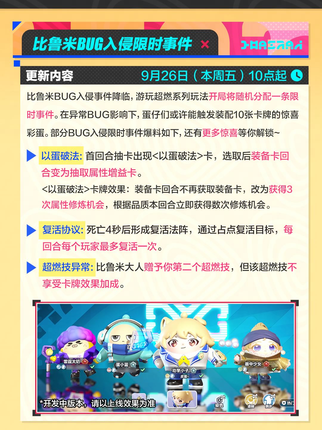 9月26日(本周五)10点起,超燃系列玩法面临“BUG大危机”!在异常BUG的作用下,活动期间蛋仔们开局后将随机分配限时事件。更多惊喜,等待蛋仔们亲自上线体验~