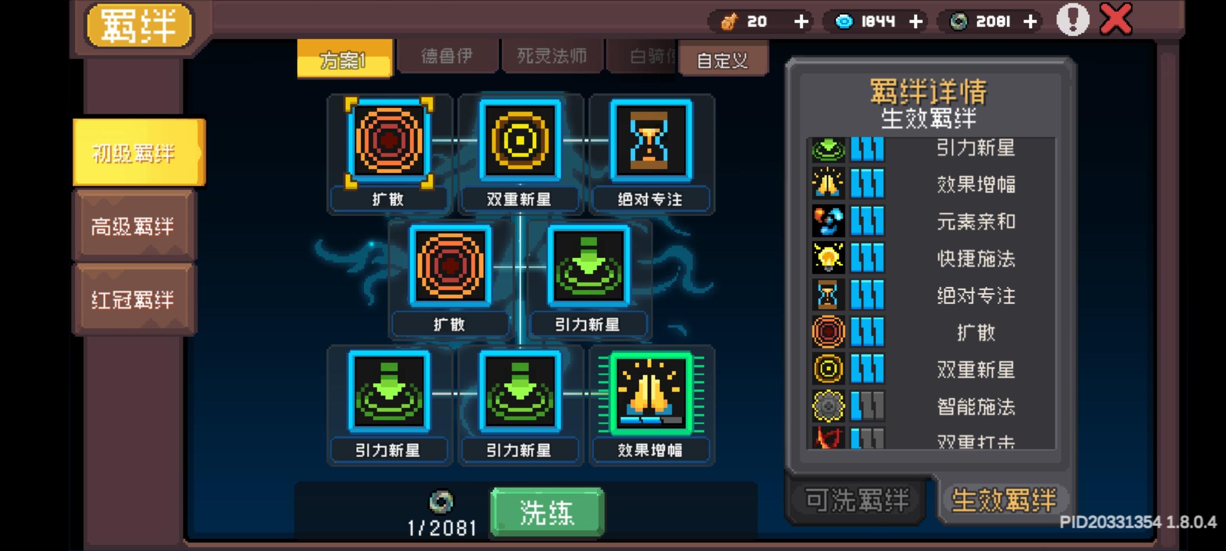 引力提供伤害并吸引敌人,效果增幅延长各种buff的持续时间,元素亲和提供大量的冰冷和电击伤害,快捷施法减少能量消耗并提供大量技能伤害,绝对专注提供冷却,扩散提升技能范围,双重新星使范围攻击额外释放,智能施法可以指定一个技能自动释放,双重打击也是额外释放技能