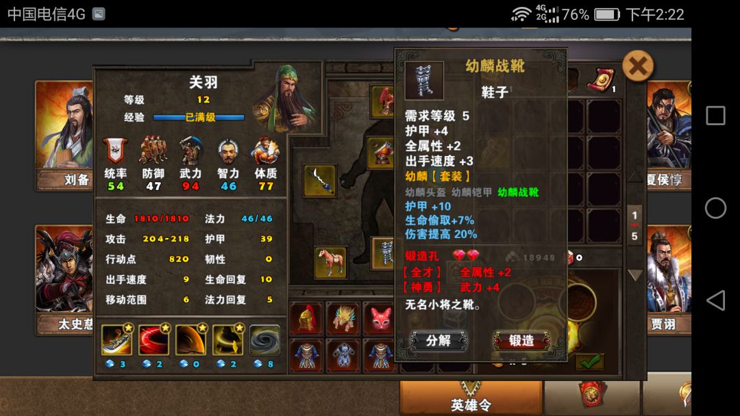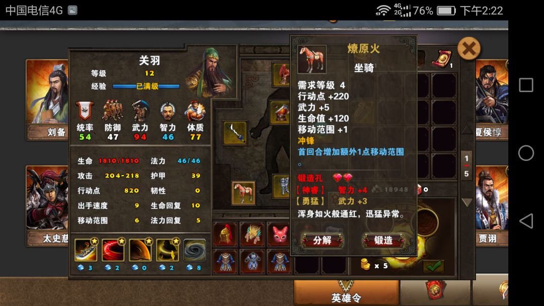 在前进关羽的过程中,主要留意拿属性点,注意拿武力和体力,完全可以通通点亮,而资源差不多的时候把弓箭统统升级鹰卫,步兵升为百夫长,给鹰卫加攻击,这个养成习惯就好了。
