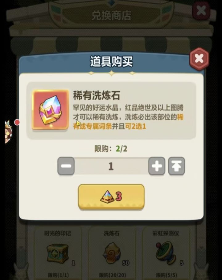本次活动有新道具——稀有洗练石!非酋玩家狂喜(我就是一个非酋[捂脸R]),这个道具我只能说有条件的玩家一定一定要去换!图腾是这个游戏的主流主力玩法,所有关卡都与图腾强弱相关,好的图腾可以跨很多战力打关卡!!