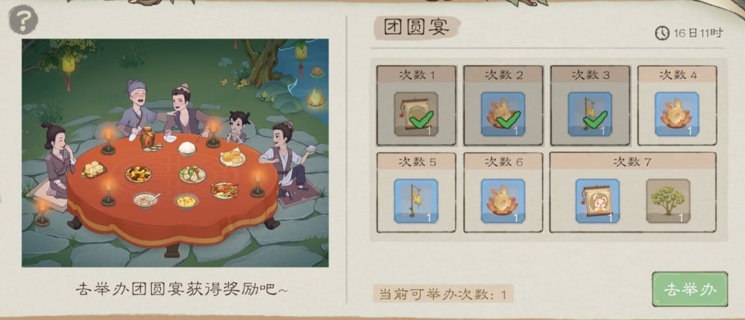 ⑤活动奖励:该界面总共7次奖励,每举办一次获得一次奖励,7次拿满(但仍可继续举办获取桂花糕、月饼、限定装饰品等奖励)