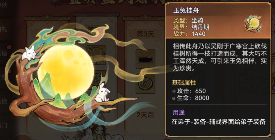 9月29日~10月5日,祖师完成签到任务即可获得星辉玉*40、限定坐骑-玉兔桂舟、限定头像框&气泡框等道具奖励。