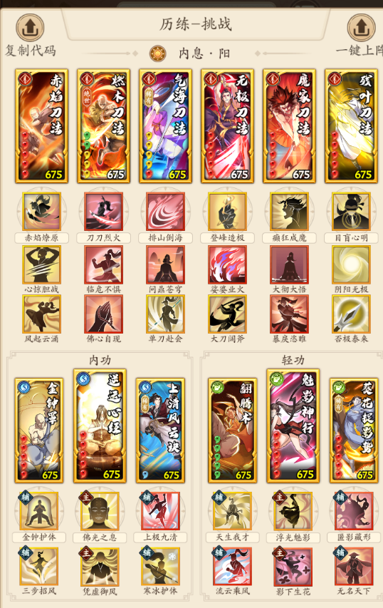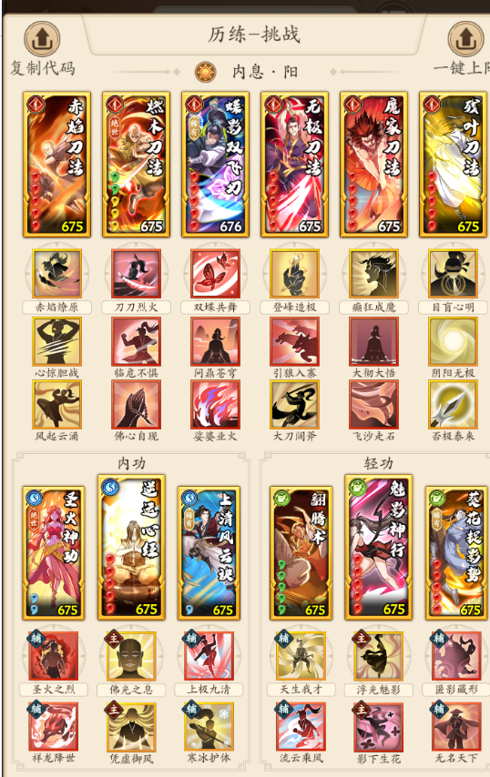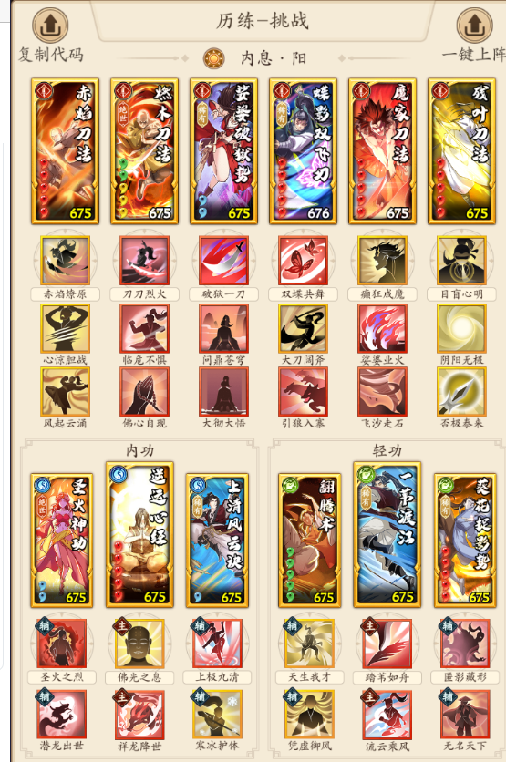 那先说下老区的阳刀,这次一次性出了3个新稀有,对比之前出的武学卡。这次3稀有其实是一套体系套中套中套,都是有联动效果。缺一不可。拉稀有优先级是轻》外》内,整体按轻红1.外金1.内金1.分配。单娑婆效果没有魔刀这么好。没有吸血了。轻是保证续航 还有伤害搭配内还有5聚、这个是这一套体现的核心。 在没有钩子之前不建议改原来阵容。只要3稀有拉起来、你上了 就是比原来牛逼、搭配大差不差。这个搭配暂时不会出因为普遍没有钩子 优先养成!