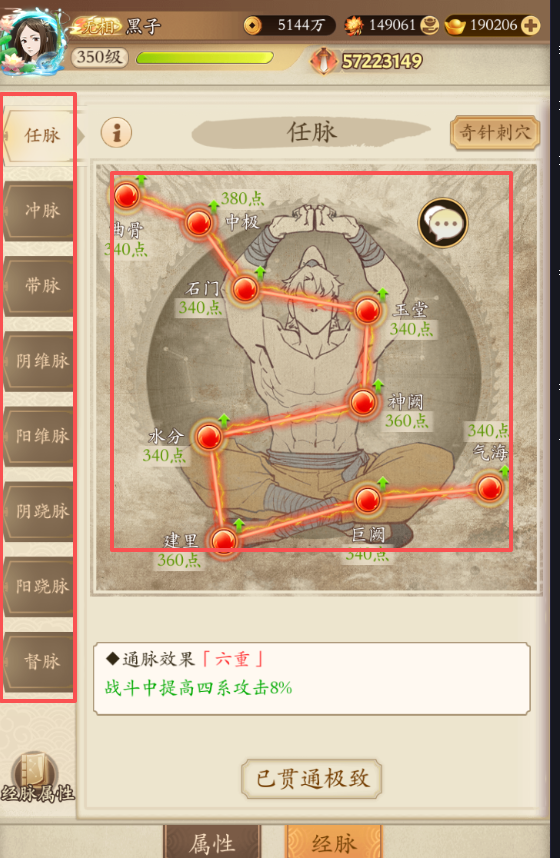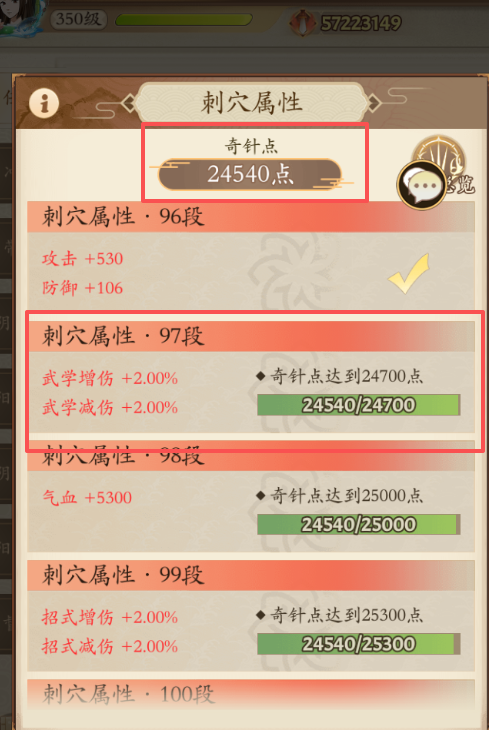 扎针一共72个穴位,这个不用看属性,就看成功率那个高点那个。凑增减伤百分比