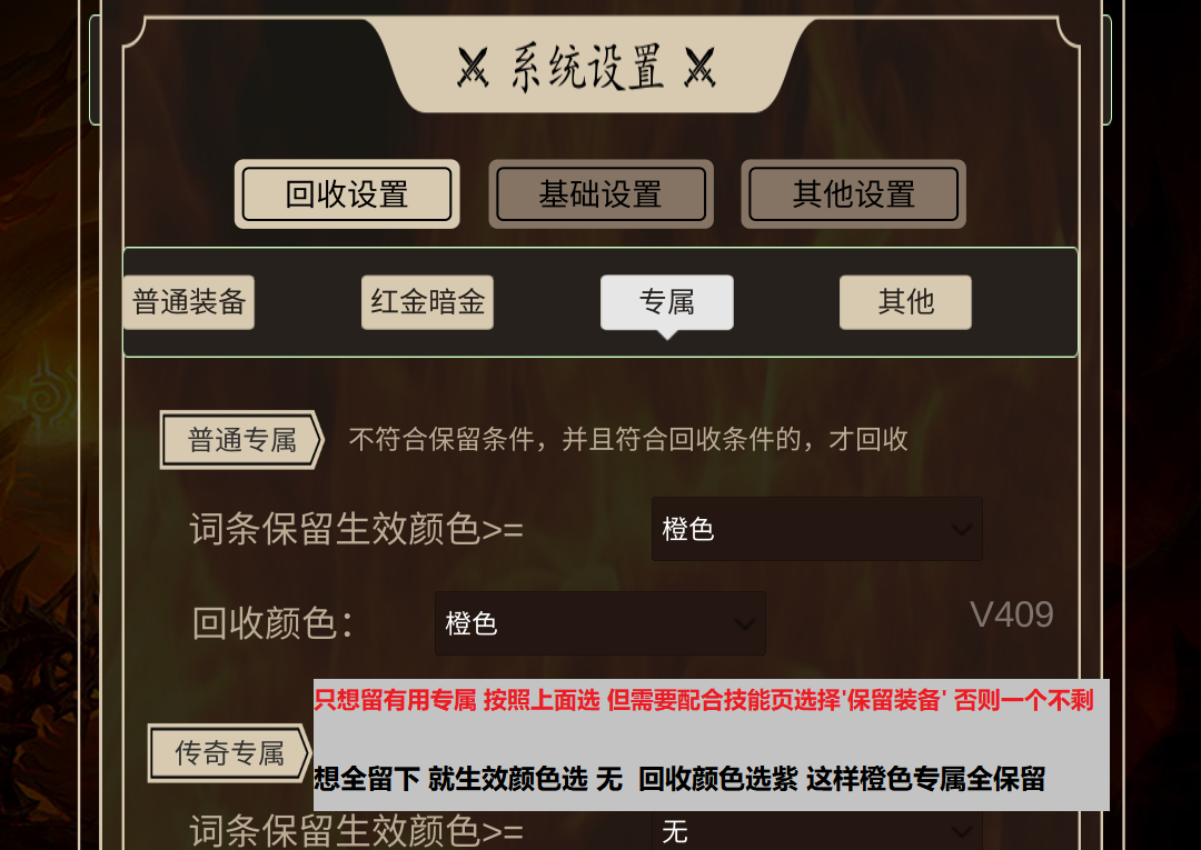 有个留材料的技巧 在技能界面把需要留的相应技能专属 对应的技能右上角 有个 保留装备 点成白实心 回收设置里 专属中的普通专属 都设置成橙色 这样有用的专属材料就不会被回收 其他技能的专属就直接回收了