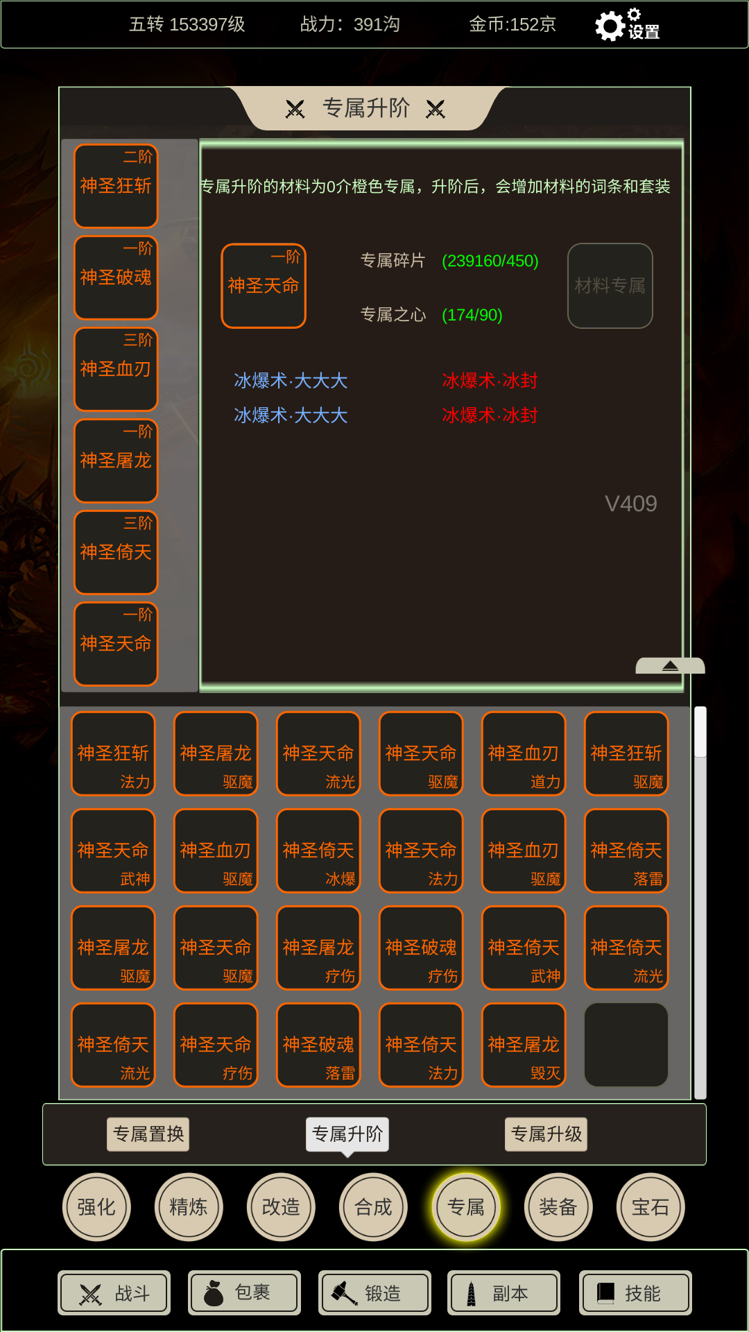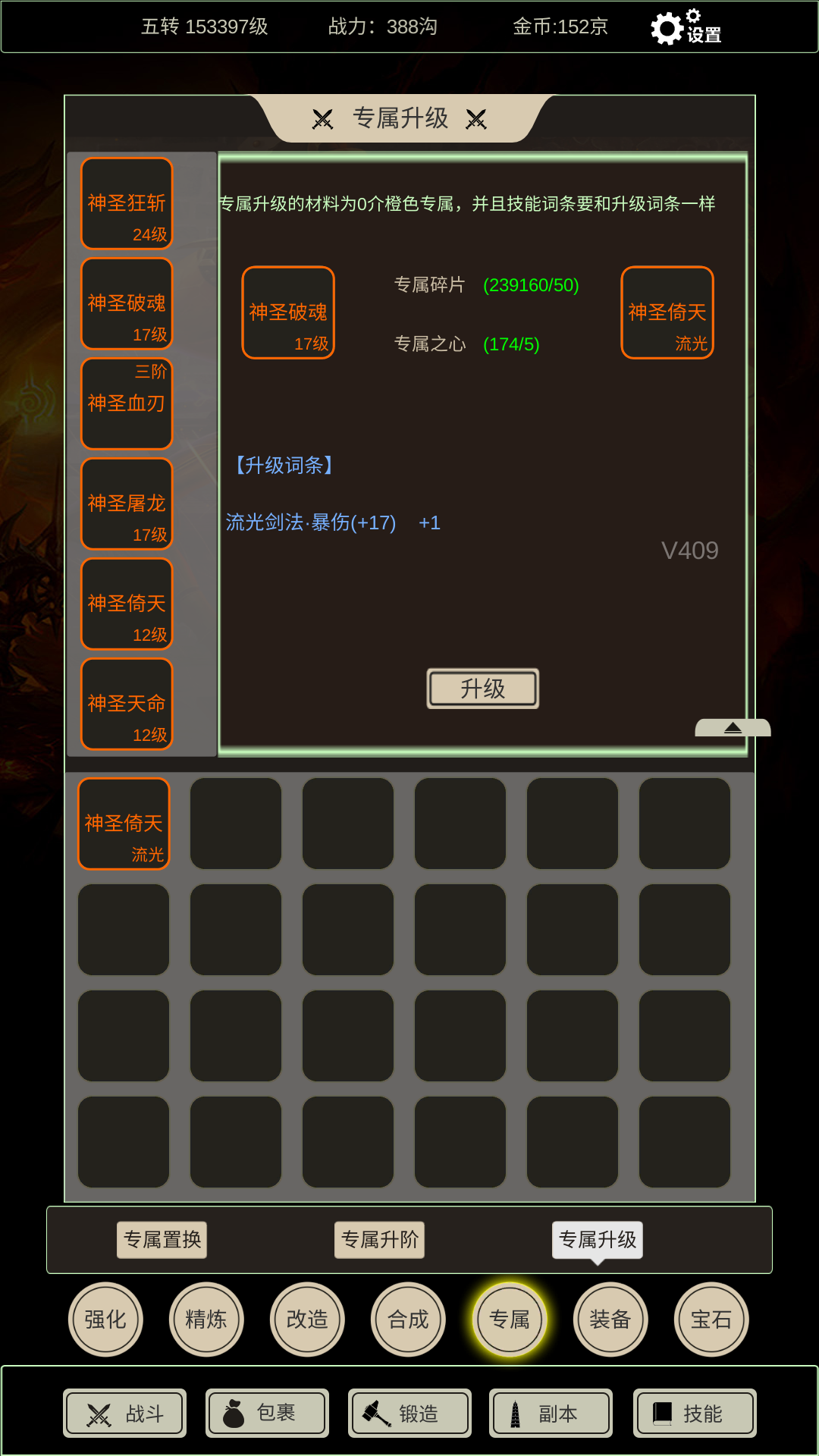 每升一级需要0阶相同技能词条的橙色专属做材料 并且消耗 专属之心五个 专属碎片五十个