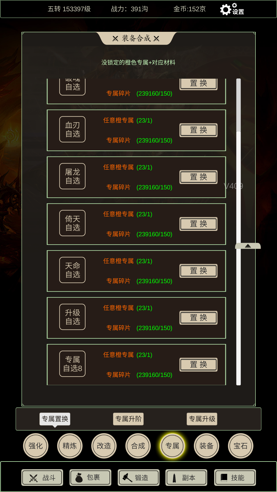 专属碎片和心资源够的话 可以去锻造的专属置换中拿资源换需要的技能专属 这里置换一个需要任意橙专属和专属碎片150个 这里的任意橙专属 不让你指定哪个 所以 置换时需要你把包里有用的提前用掉或者锁上 否则就是用个有用的橙专属+150碎片换了个需要的橙专属 平白损失150碎片
