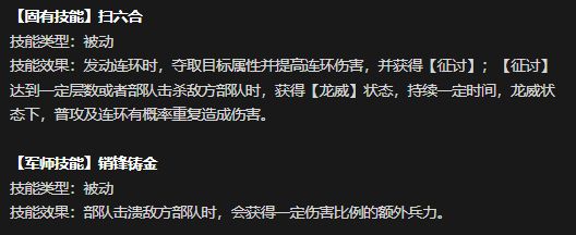 配队推荐:由于刘秀需要“自身造成非被动直接伤害”才有概率引发天雷,所以猜测刘秀的就业方向会是连环枪或连环骑。搭配就是刘秀赵云庞涓(考虑到两个都是骑枪双极,跑的快,没赵云就换岳飞),军令够的话就换王彦章。通过带上连击军师王彦章、庞涓,获得【连击】状态,提高天雷的触发概率。连环枪只有在雨天推荐用,其他天气建议用连环骑,因为正常情况下骑兵的移速优势会比枪兵强很多,但是雨天的话部队移速会下降,骑兵在此基础上还会额外下降,所以雨天就不要用骑兵了。