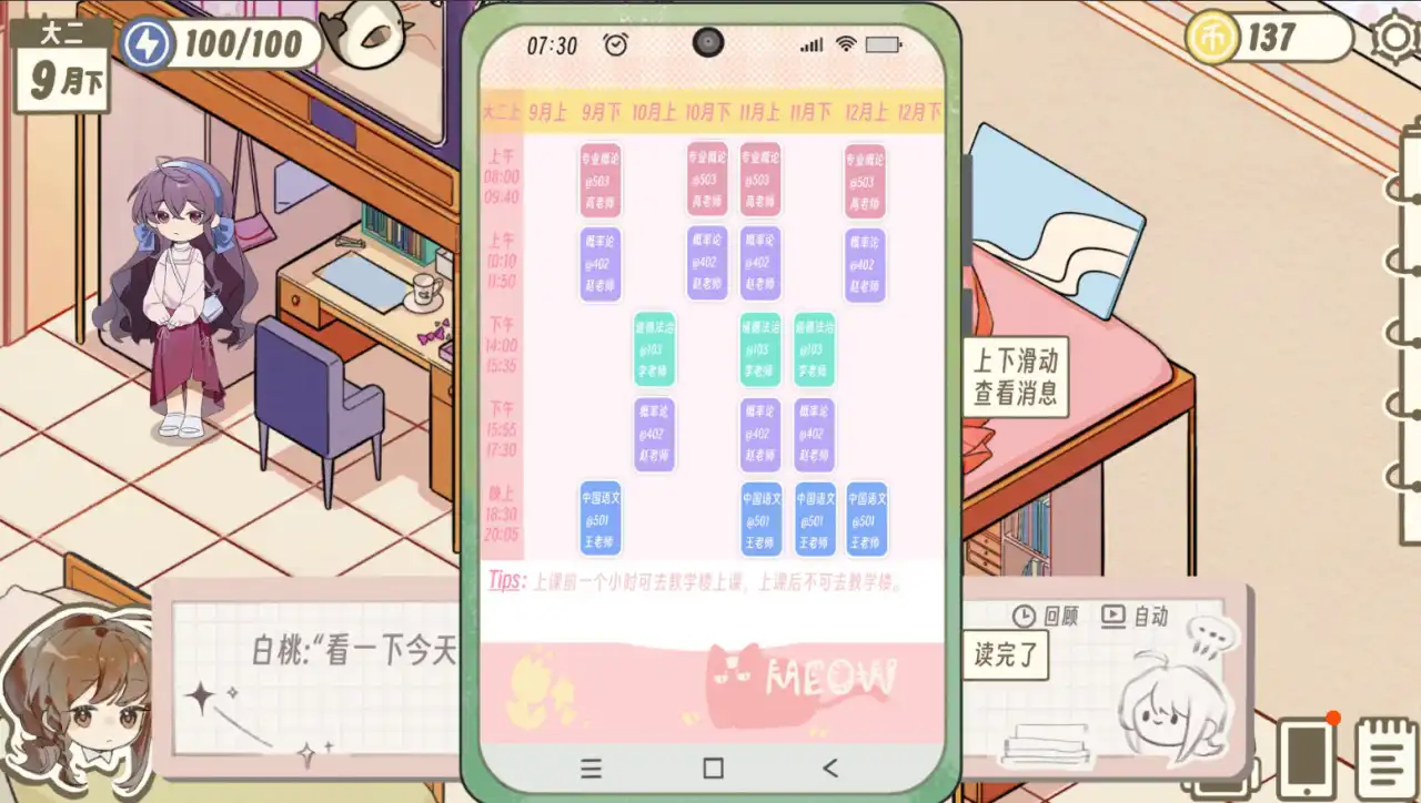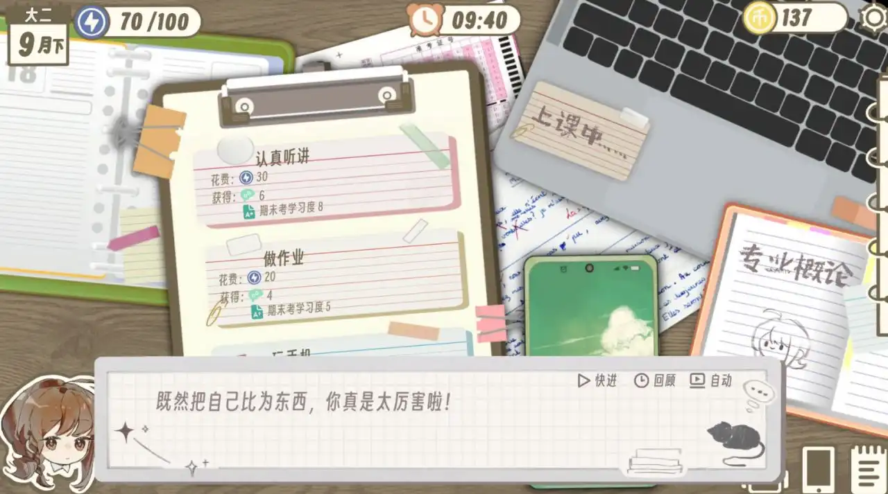 那在上课期间,你可以选择认真听讲,来增加这学期的期末进度;或是做作业,增加其他科目的学习进度;要么就摸鱼,直接玩手机,这样你还能恢复一些精力。