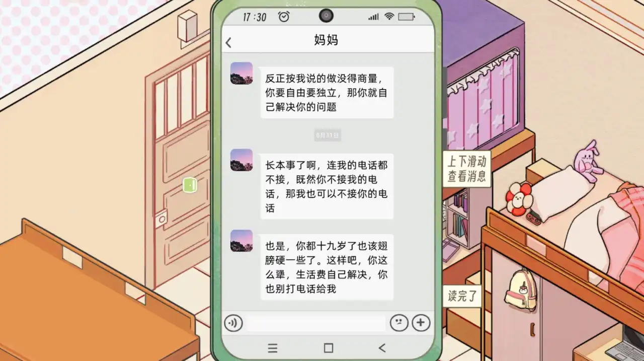 生活费自己解决,别打电话给我。女主被妈妈断生活费的原因,是因为上学期挂了两科。由于被指责不好好学习,且女主也不接电话,因此这一学期的生活费就被停了。