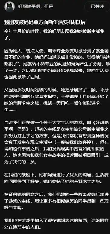 正好,制作人在这段时间也是大二,她利用课余时间正在推进《好想躺平啊,但是》的开发进度,也正好在这期间她知道了那位好朋友的谋生故事,于是在制作人取得朋友同意后,把她的“大学求生"故事——放进了游戏中。