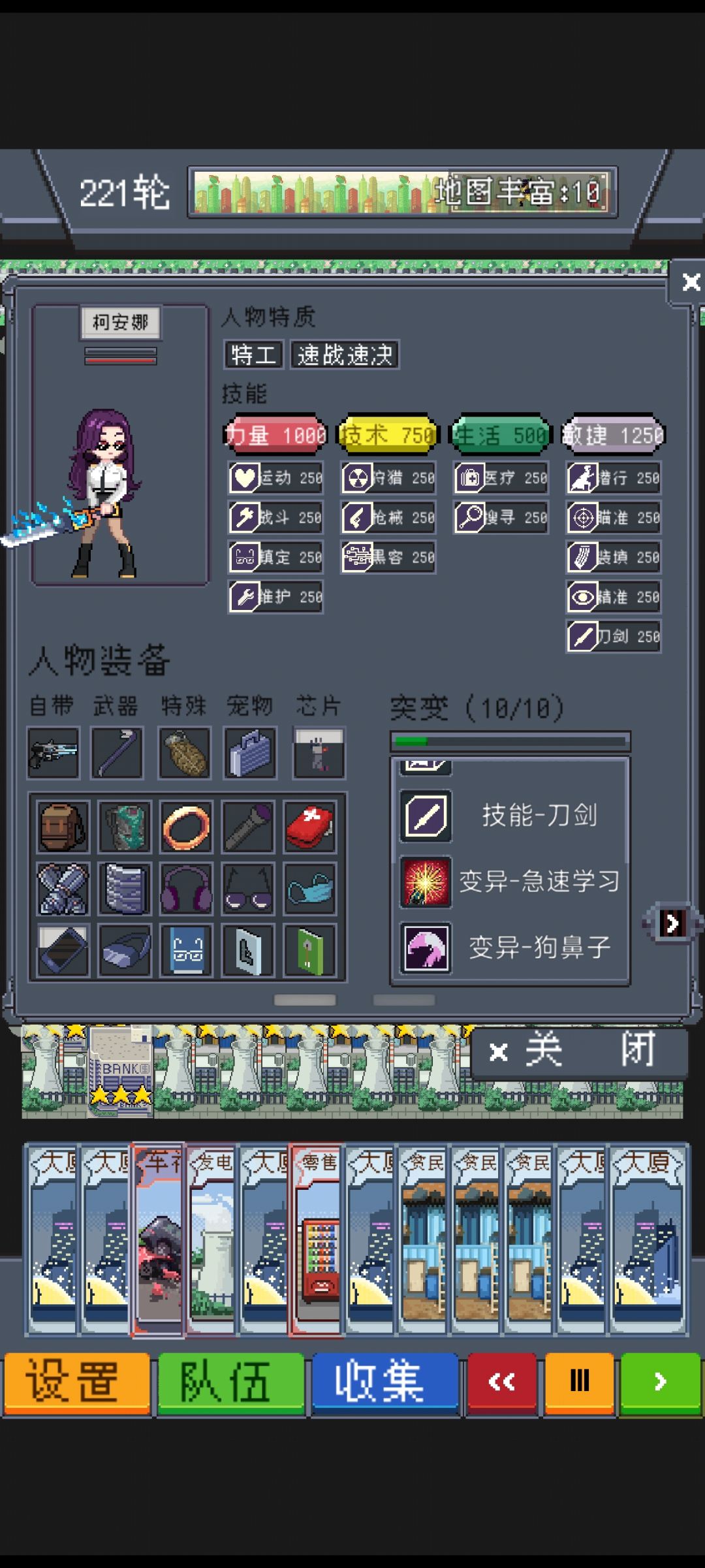 我这些人物都是全技能突变+致死+狗鼻子,有多的空位可以上极速学习,旋风斩,子弹拐弯之类的。