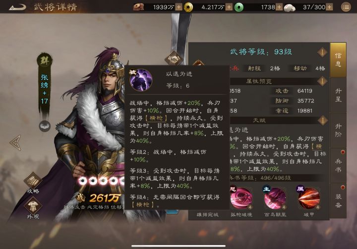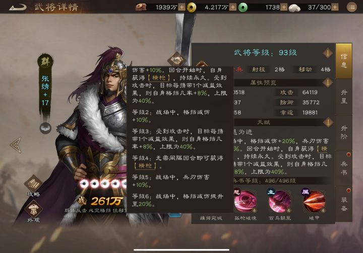 大家看张绣的技能 自身携带20%格挡减伤 加上对方有debuff的情况下自身增加格挡率 技能还能给地方增加降低双防的debuff 这样的情况下 对于搭配吕玲绮进行肉盾抗伤还是非常有效果的 前期过度是非常值得练的普通武将 获取难度也不高 值得培养