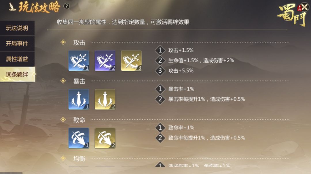 这里帮大家总结,增益共只有七套分别是:攻击、暴击、致命、均衡、守护、吸血、冷却。看名字就能轻易知道这七套增益分别加强的是什么。