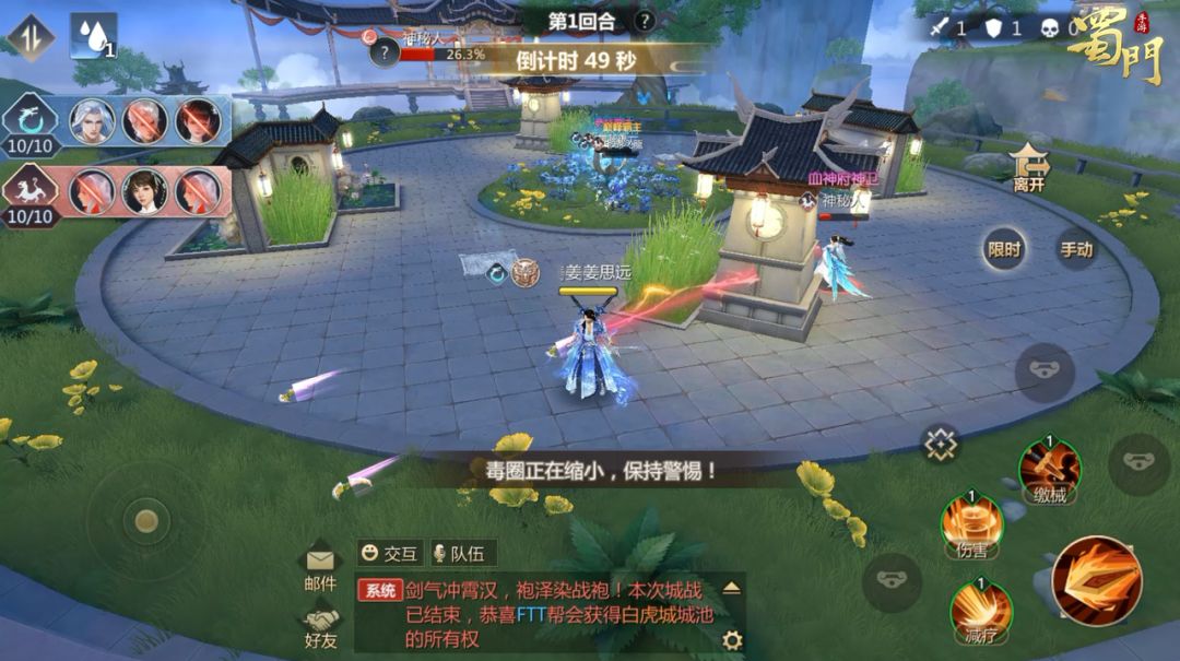 而当对战超过一定时间,场地外将会出现毒圈,并持续的向中心缩圈,进入毒圈内将持续不断地扣血,此时也就到了最终决战的时候了。