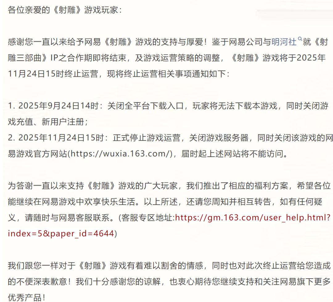 今日(9月24日)下午三点,网易射雕公众号发布公告,宣布游戏将于2025年11月24日15时终止运营。
