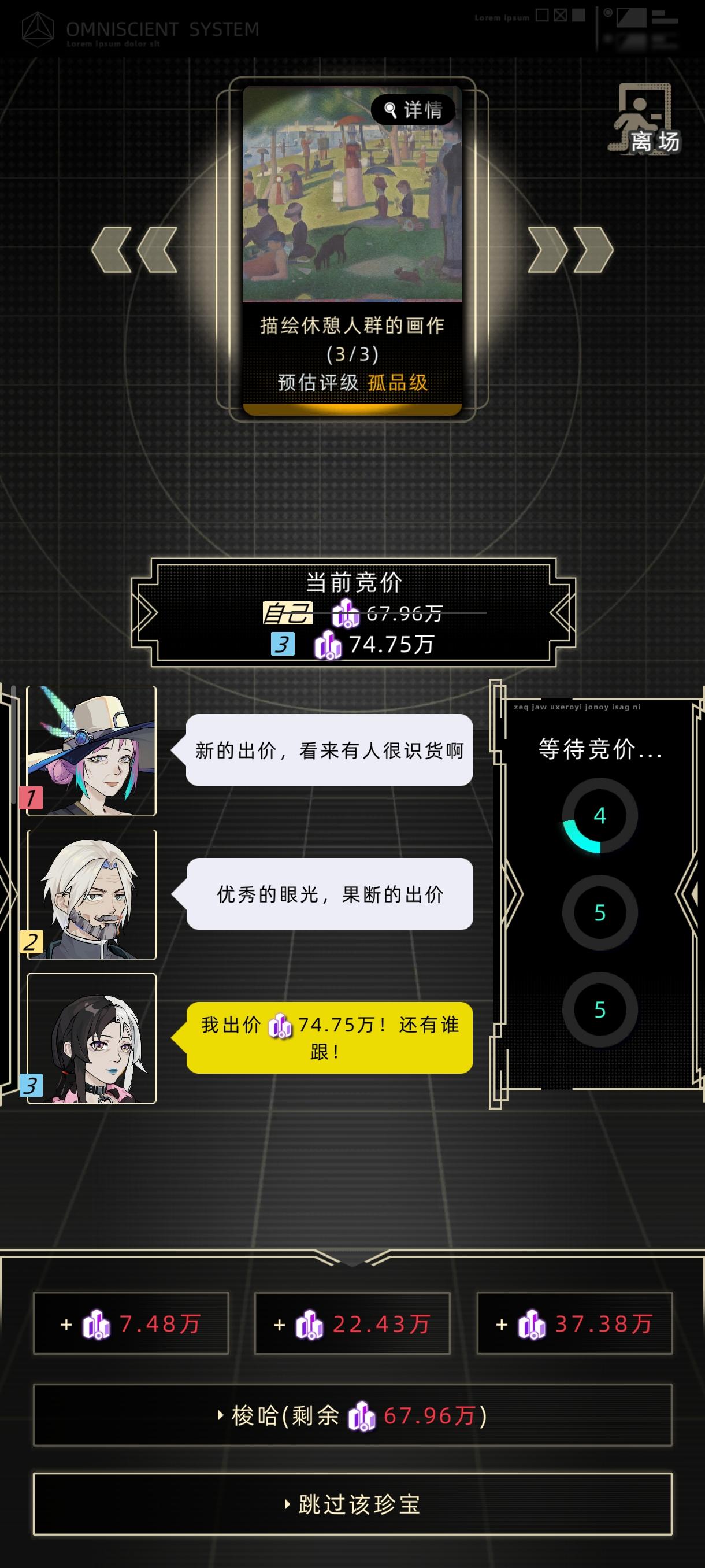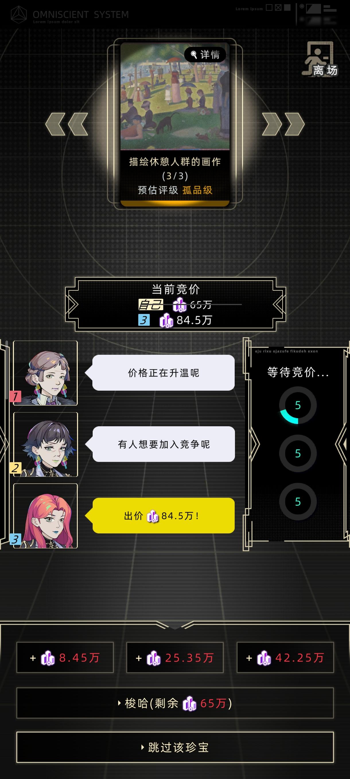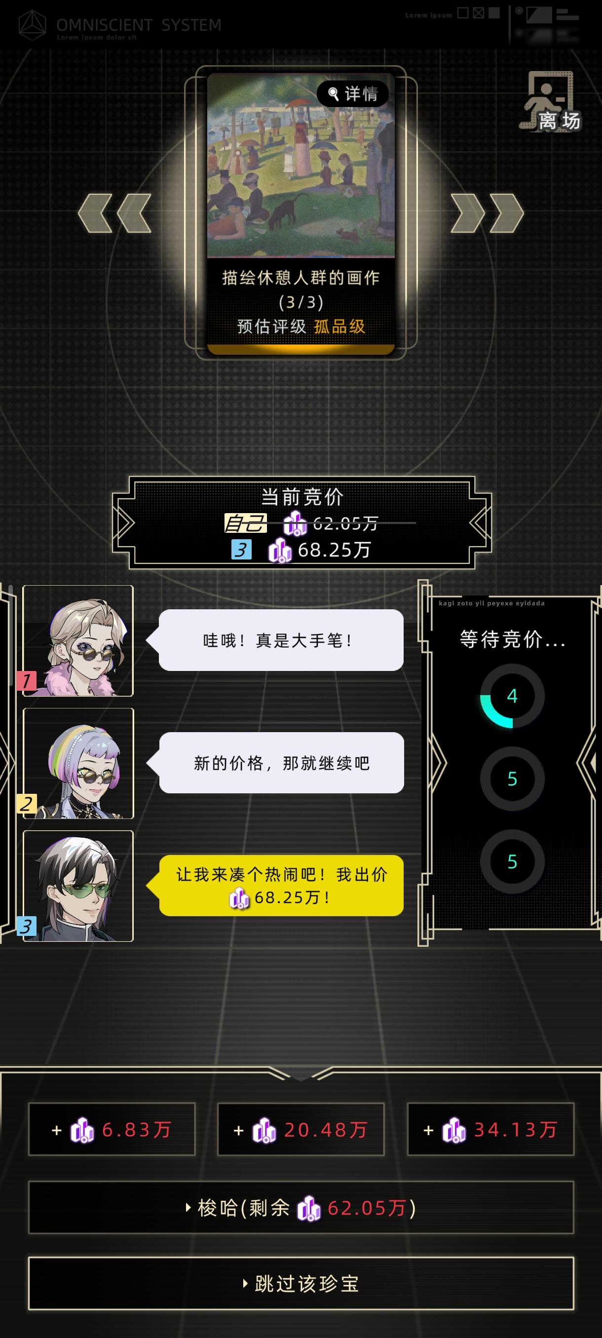先说结论:按照建议携带金额的120%入场即可成功,先等别人出价,在第三次成交的最后3秒内加价,直到只能梭哈为止,实测成功率在50%以上。