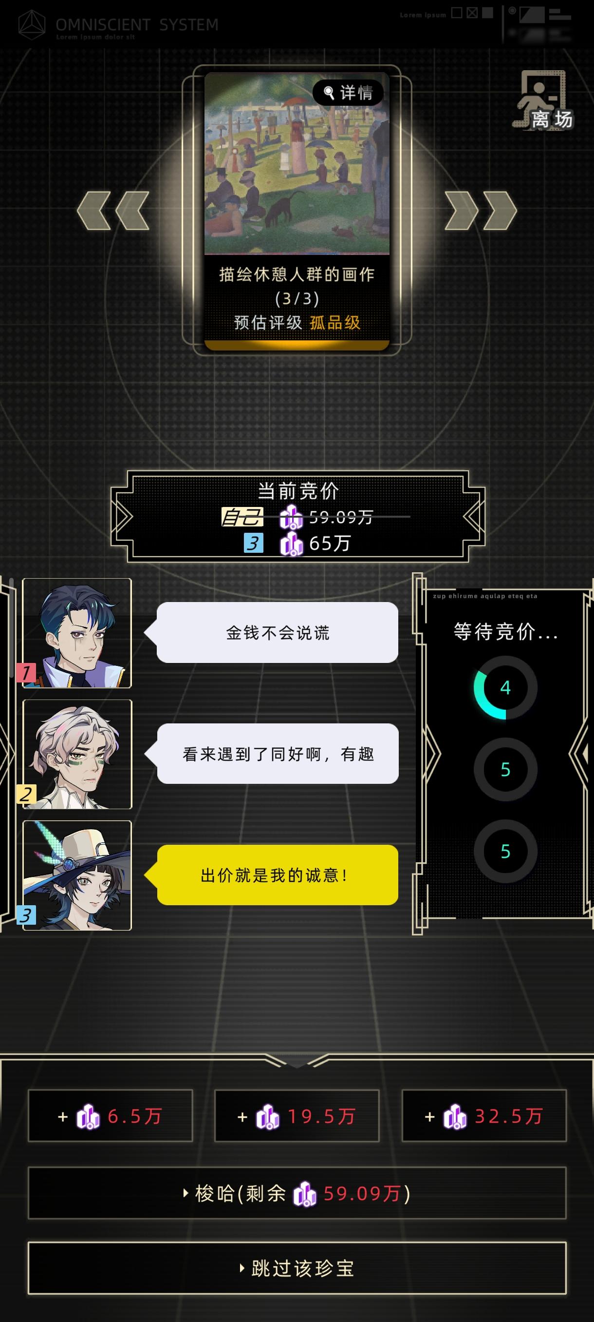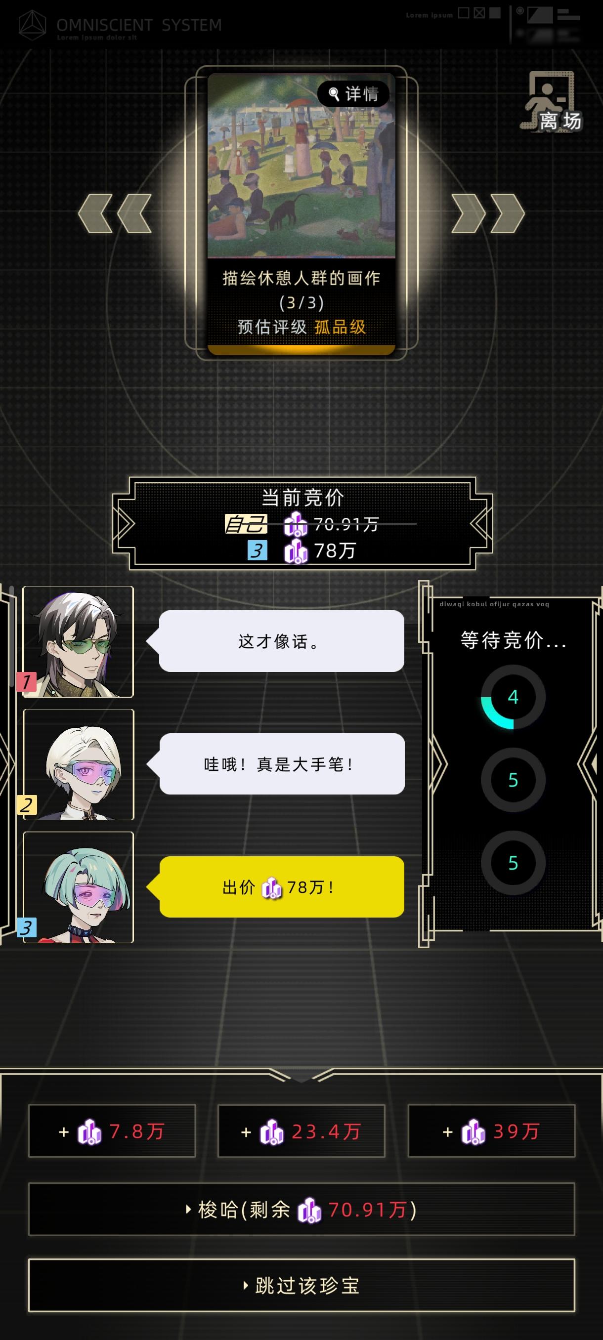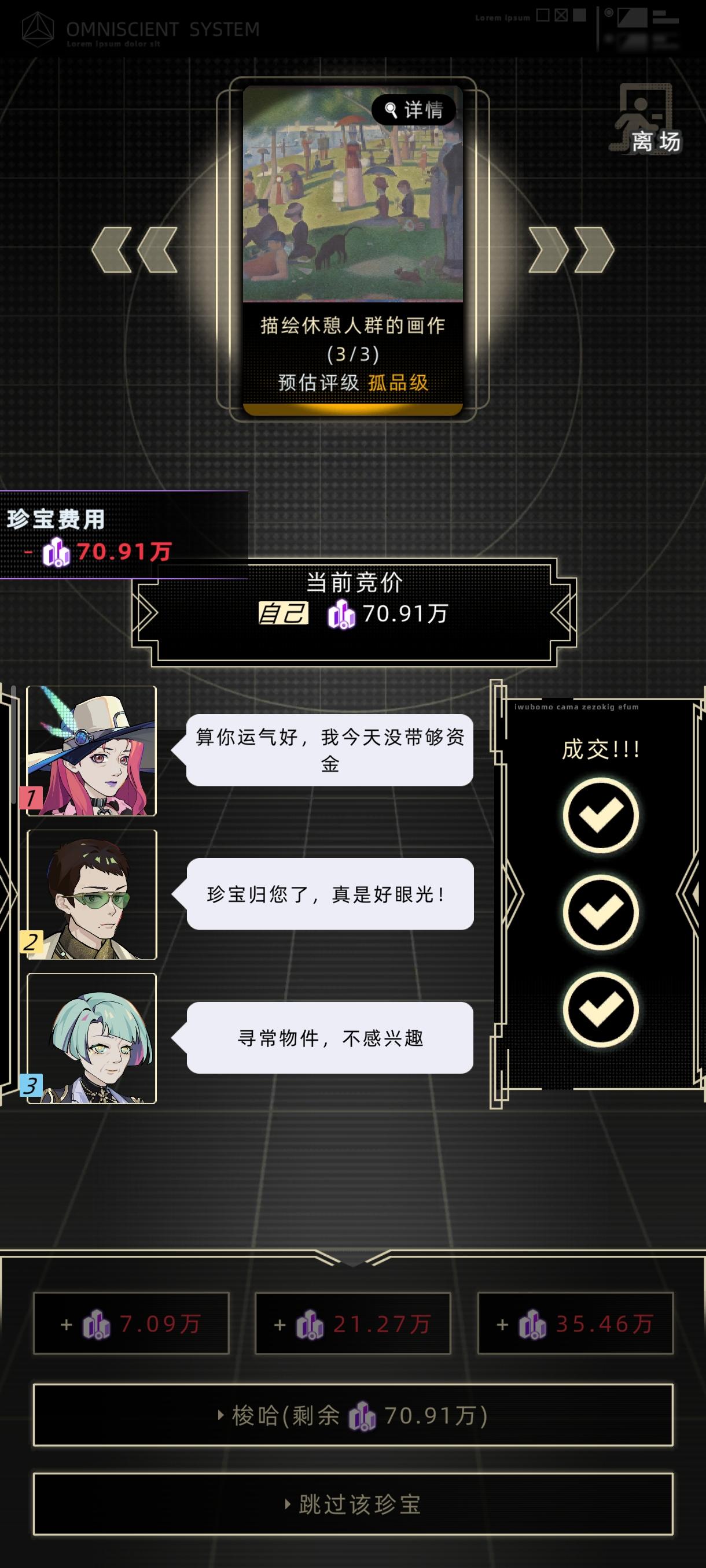先说结论:按照建议携带金额的120%入场即可成功,先等别人出价,在第三次成交的最后3秒内加价,直到只能梭哈为止,实测成功率在50%以上。
