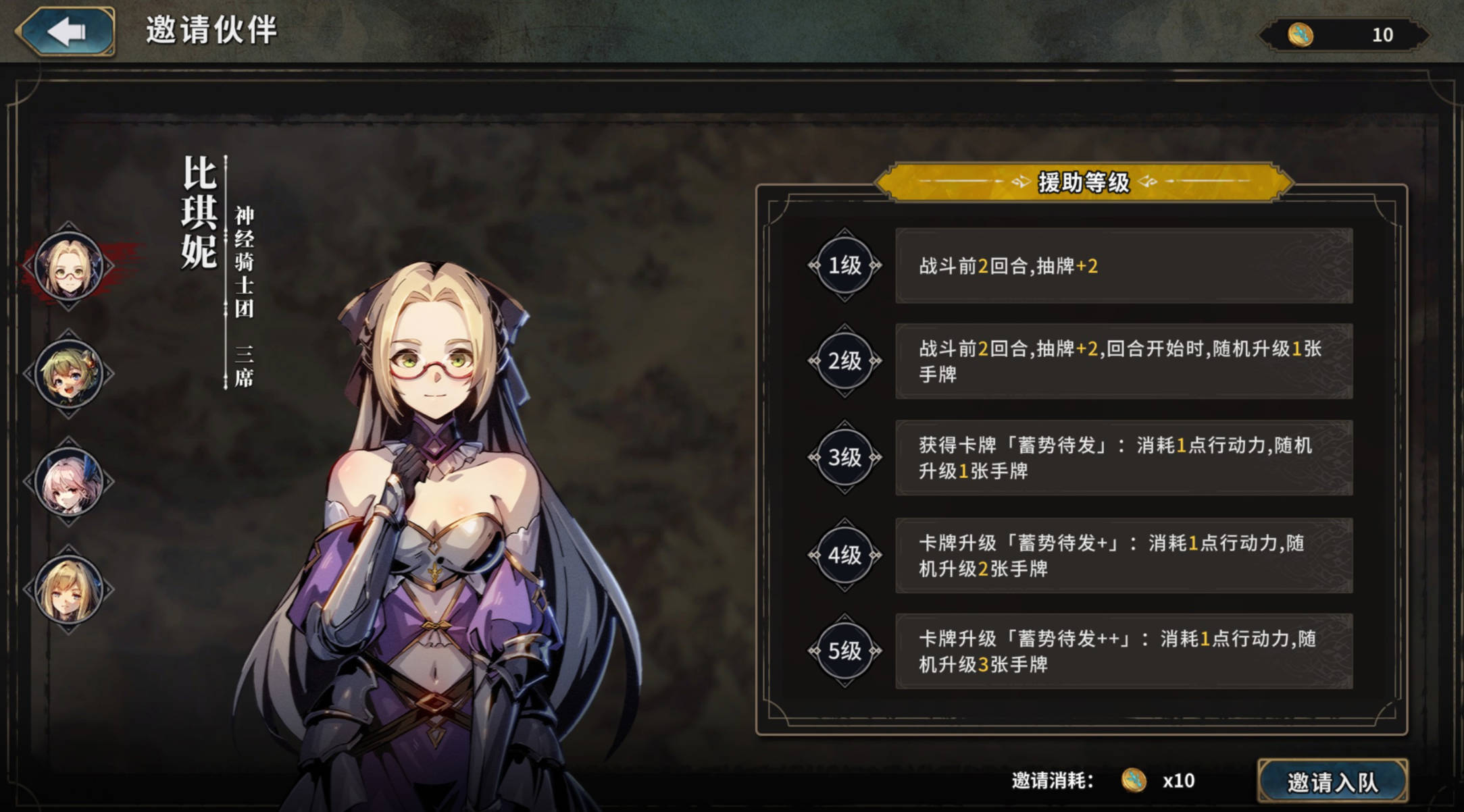 加入后的伙伴并不会出现在战场中帮助主角攻击敌人,而是会使用援助技能来被动的强化主角。当玩家在游玩过程中获得的金盾越来越多,还可以招募其他的伙伴或者是强化已有的伙伴援助技。
