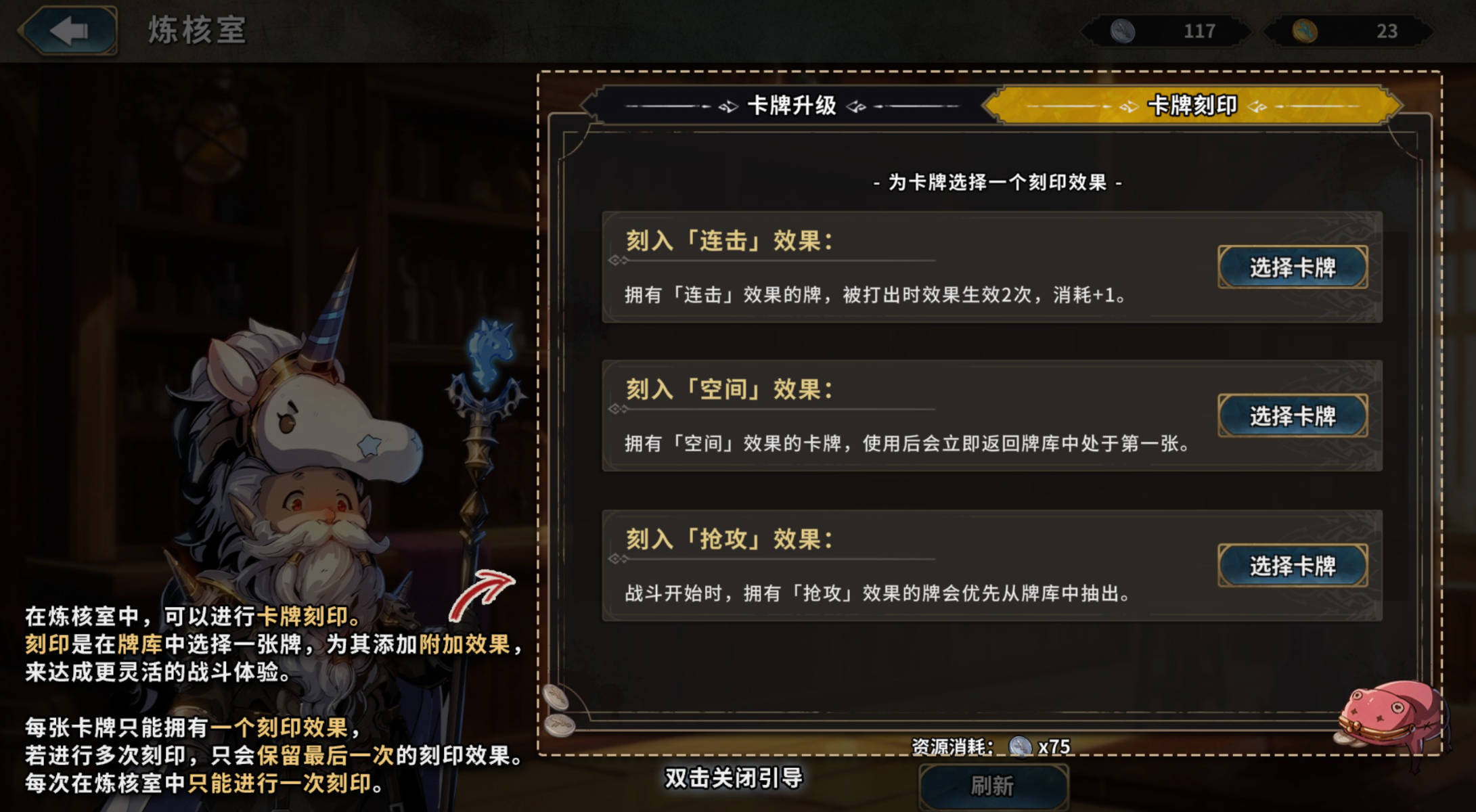 游戏中的卡牌类型总共有69张。玩家初期除了最基础的加盾以及伤害牌外,其它的牌都需要在关卡内获得。有的需要购买,有的需要升级,有的还需要“刻印”,而刻印后的卡牌效果会变的十分的强力,且每张卡牌只能拥有一个刻印效果。