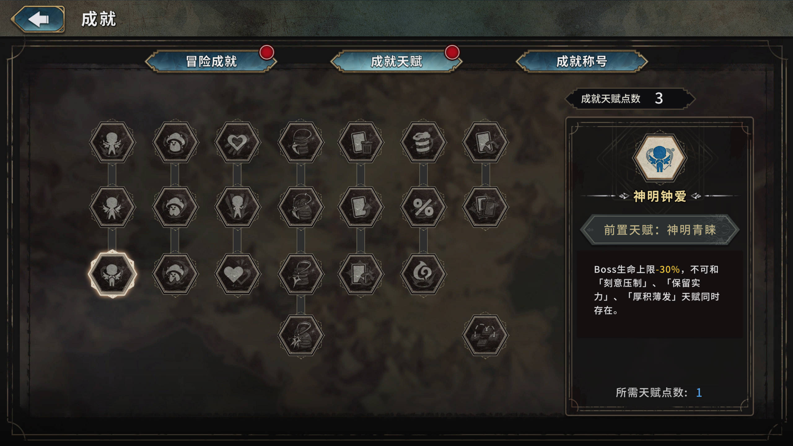 成就天赋:玩家在游玩过程中获得的任意成就点数,十分强力。可以强化或者弱化boss,甚至还可以无视冒险路径的三选一,想怎么走就怎么走。