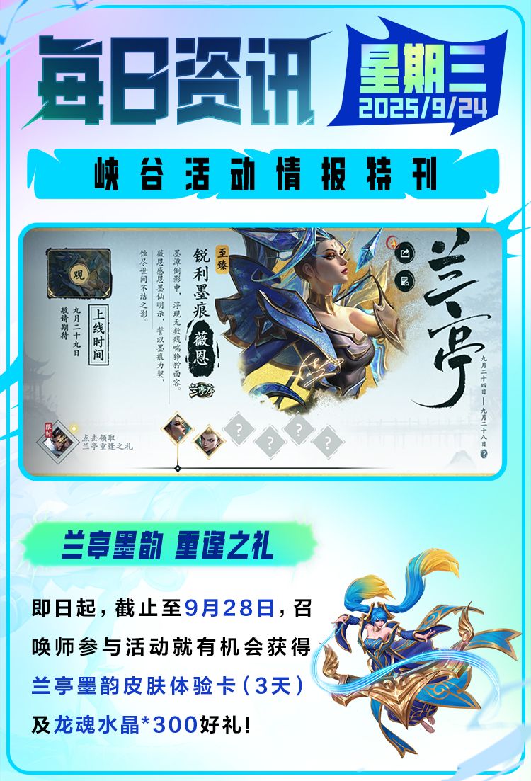 墨香未散,福利已至!“兰亭墨韵重逢之礼”今日惊喜来袭,快来解锁皮肤体验卡(3天),在峡谷中领略国风雅韵之美~