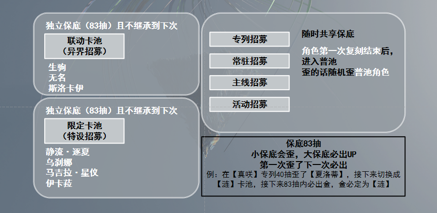 1、限定和联动:保底完全不继承,也不跟其他任何卡池互通,要抽就这个池子抽到出,不然保底就浪费了,下一次还是从头还是算抽数。
