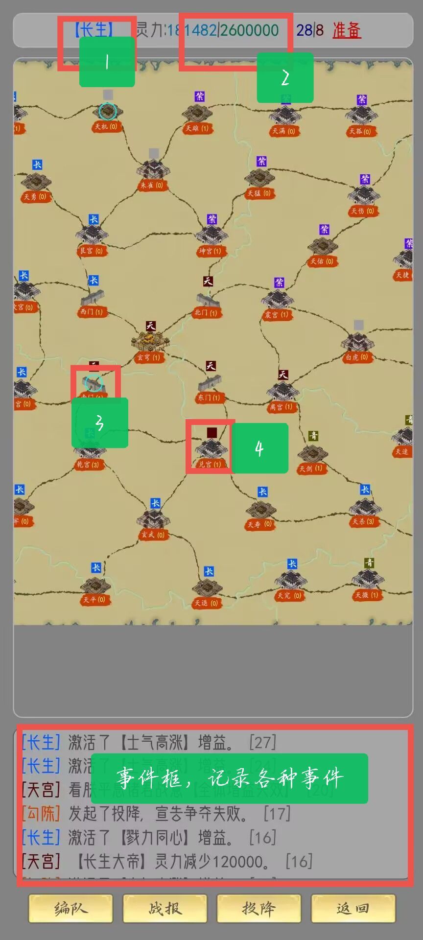 11.天宫AI:天宫会随机向八卦星宫(其他势力占领)或者天门(其他势力占领)出发队伍,天宫队伍属性很低,起到骚扰作用,也就是八卦星宫占领的越多,越容易成为天宫的目标,天宫占领之后会处于占领中状态,不影响其出兵!