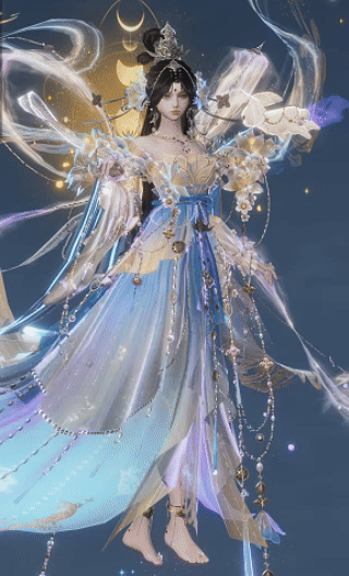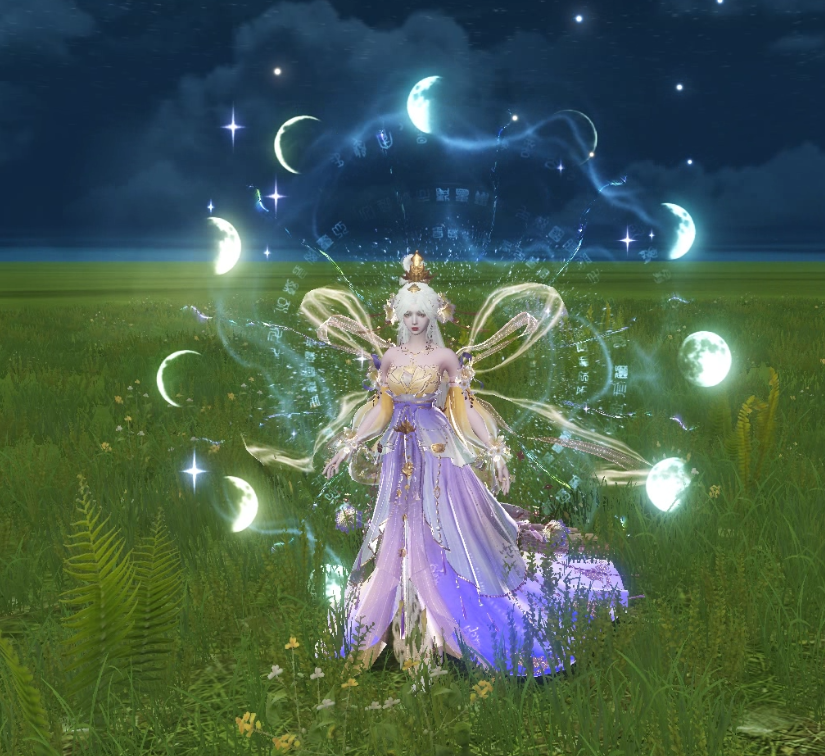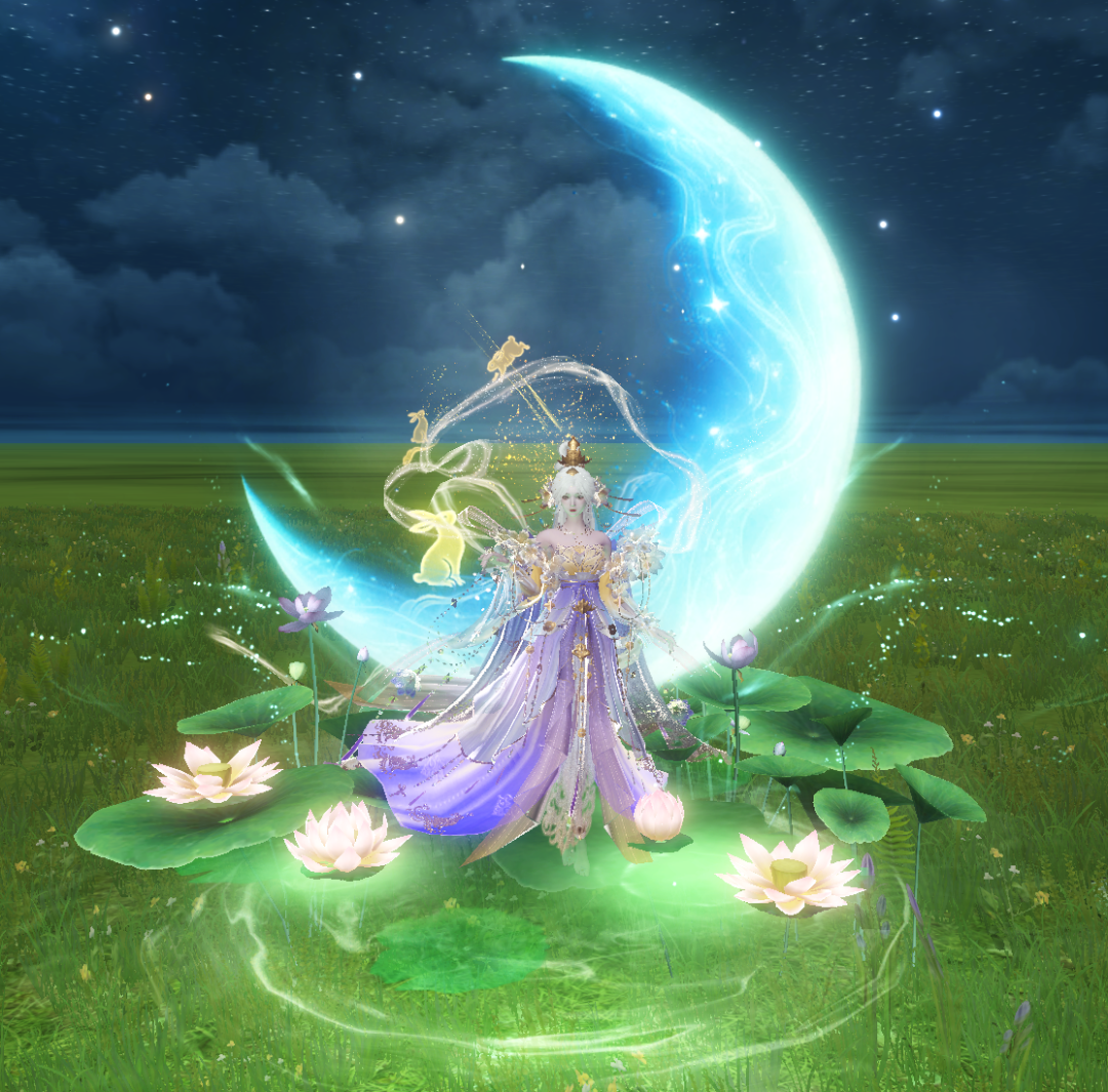 使用盈虚情绪天空盒后,天地改换,化为传说中月御的神域。夜幕低垂,云海与星夜相接,月相由朔至望悬于天际,清辉交叠,时间仿佛在此凝滞,只余永恒的宁和。