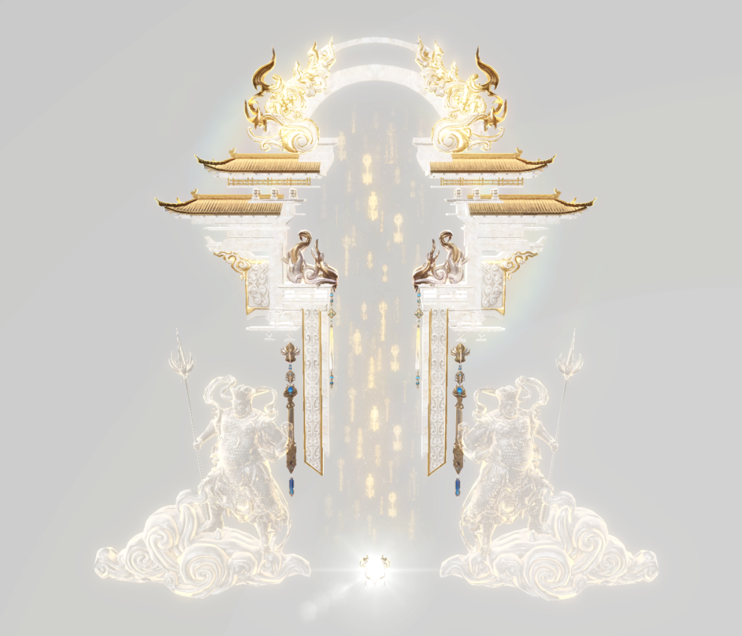 屋脊·龙门白玉金瓦,通体透白,散发着莹莹神光。两侧威严天将执戟肃立,巍峨天门内,金光符箓交织成幕。这些由天柱山道家真人绘制的符咒蕴含无上道威,循环流转间,道法之力便自成一道结界,震邪守清。