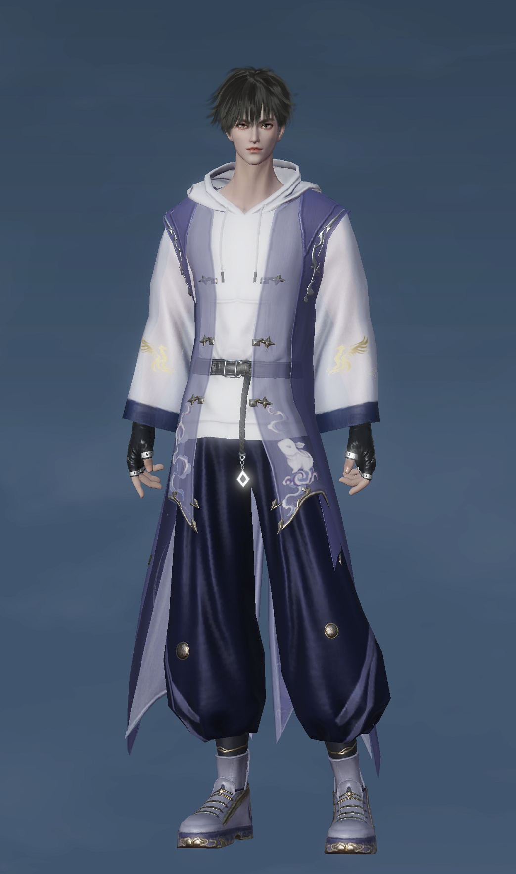 橙品男装·司命以现代白色卫衣为基础,外搭一件古风长褂,休闲与飘逸并存,仿佛是偷偷游历人间的年轻仙君。