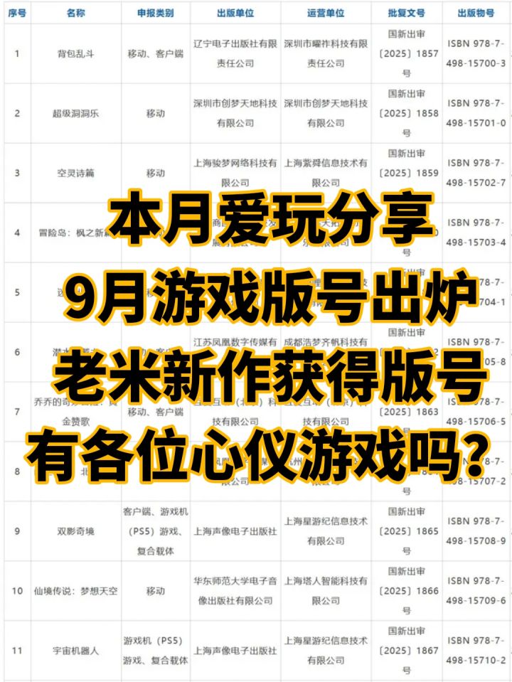 官方相关平台于2025年9月24日发布了新一批的游戏版号审批信息