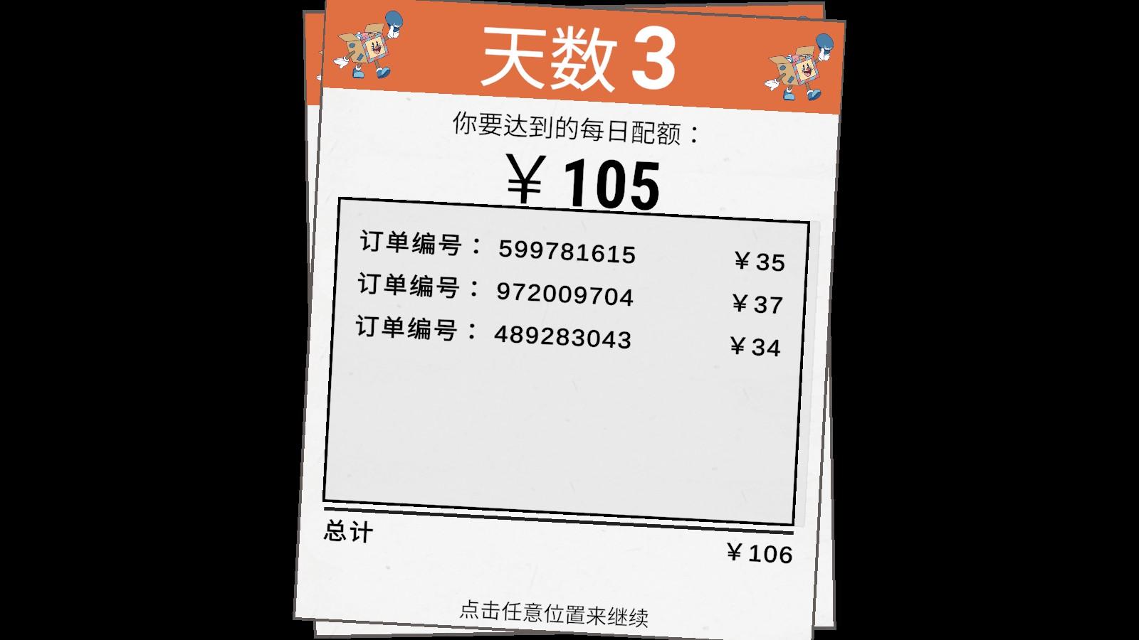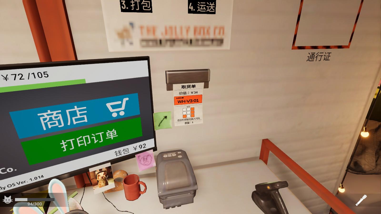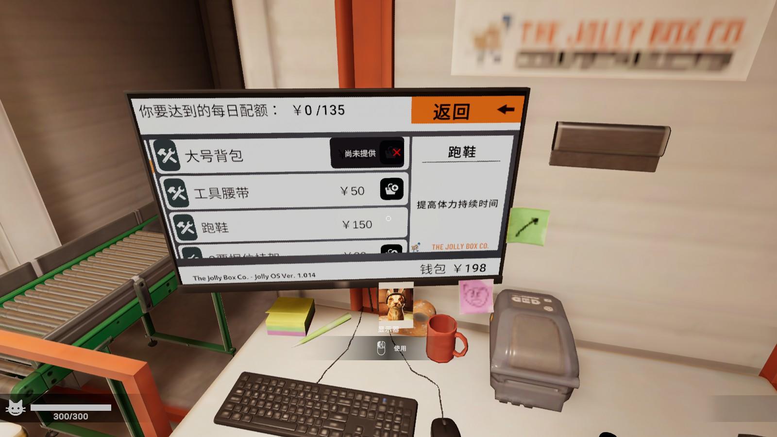 在家里的电脑里,主角可以给自己购置提高赚钱效率的工具,比如可以记录订单信息的扫描仪,可以让你跑得更持久的跑鞋,以及解锁更多区域的通行证;也可以购买一些猫咪用品提高“猫主子”的生活质量,比如玩具、猫粮,让猫咪的幸福度更高,相当于延长了你的单日工作时长,让你能有足够的时间完成足够多的订单从而达成当天的配额任务。猫咪的幸福度会在新的一天到来时回满。