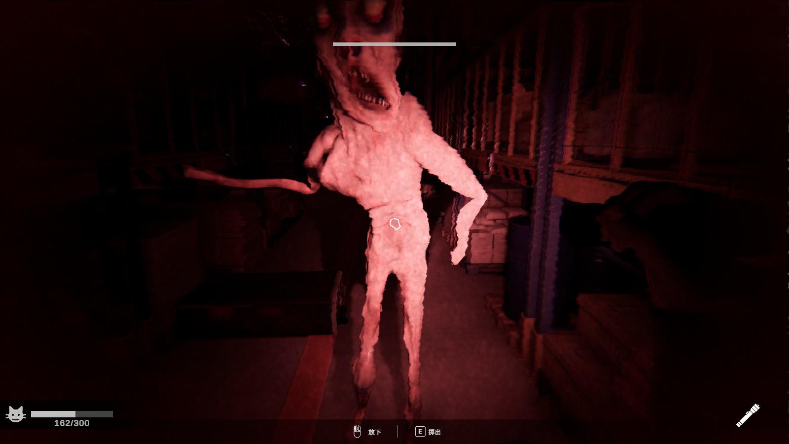 这个仓库在你的第一天工作期间是没有任何异常的,所以如果你不是一周目玩家或者提前看了攻略的话,可以尽量在第一天多赚点钱,为后面打基础,因为从第二天开始,仓库里就有“鬼”在四处晃荡了。这些“鬼”的画风看起来非常像“S某P”基金会里面的——纤细的躯干顶着个大脑袋,走路速度不算快但一旦发现了你就会穷追不舍,还会发出令人头皮发麻的声音。如果不幸被它们抓到,那主角就直接死翘翘,GAME OVER。不过也不用太担心,这种失败方式和猫咪幸福度降到0的失败是一样的,你可以从你失败的这一天重开。