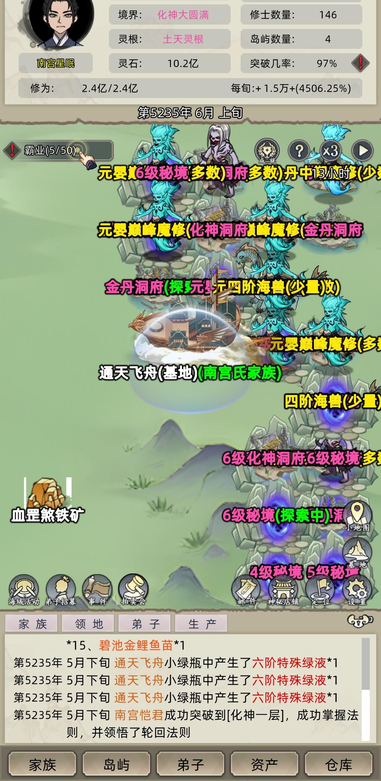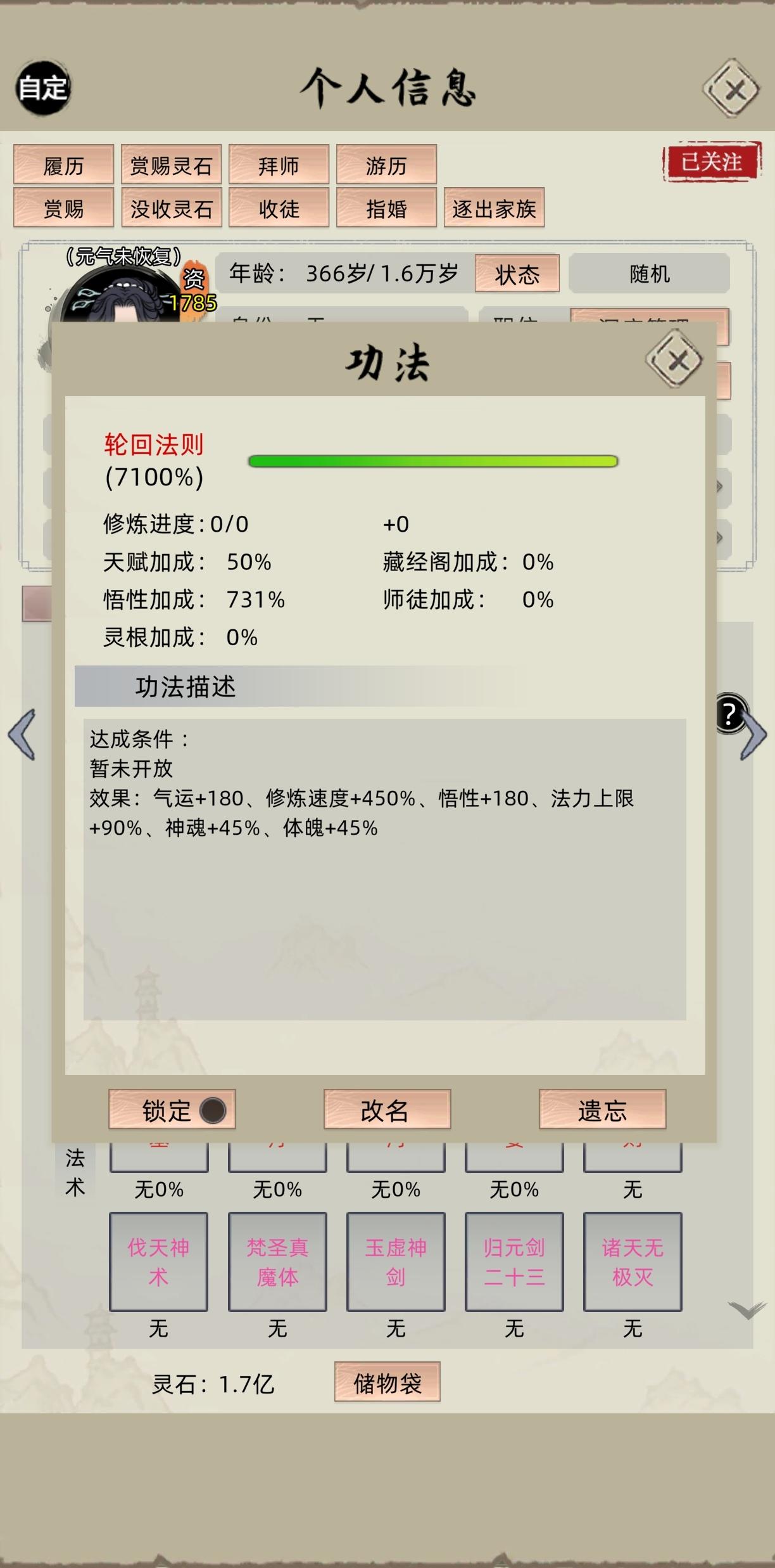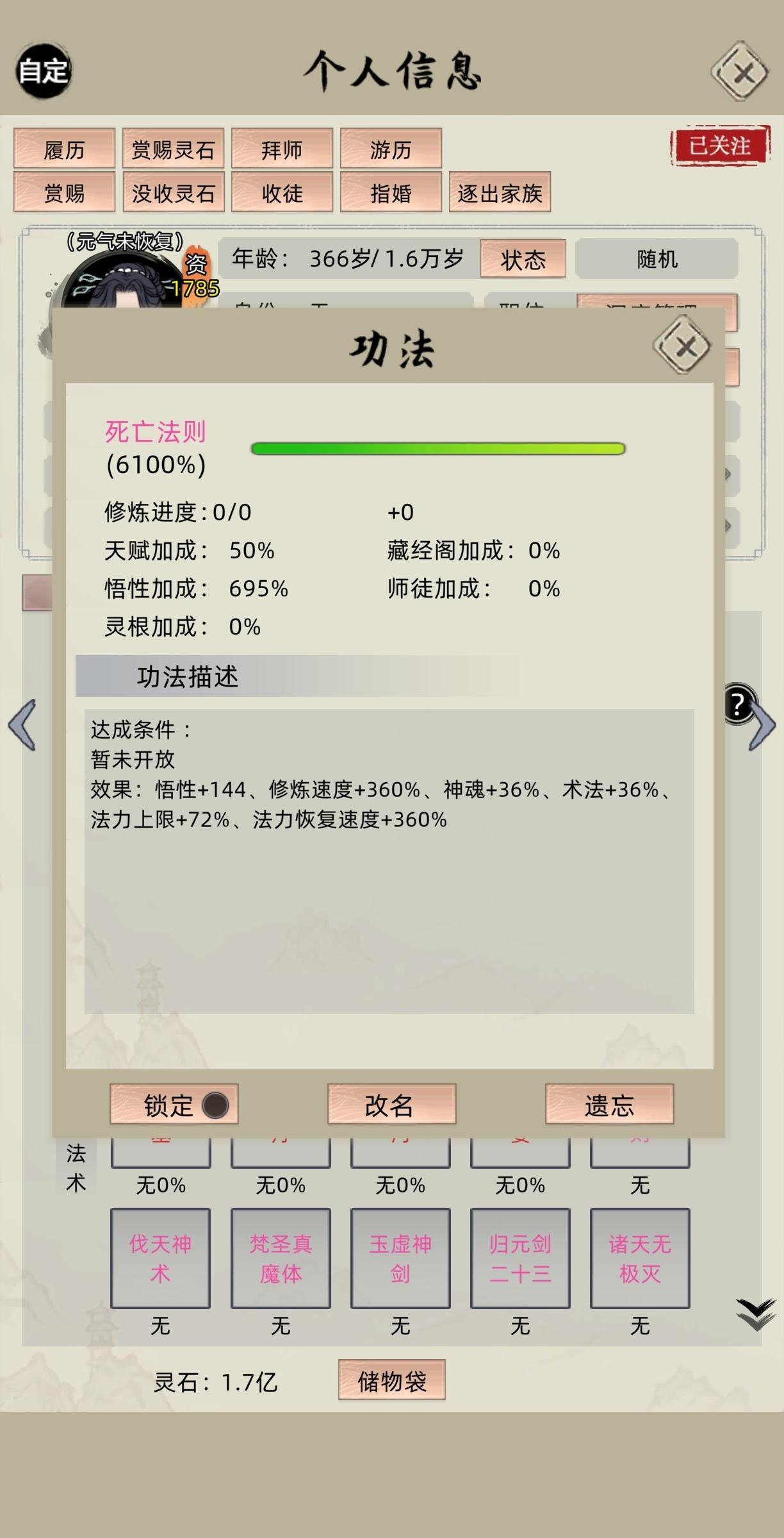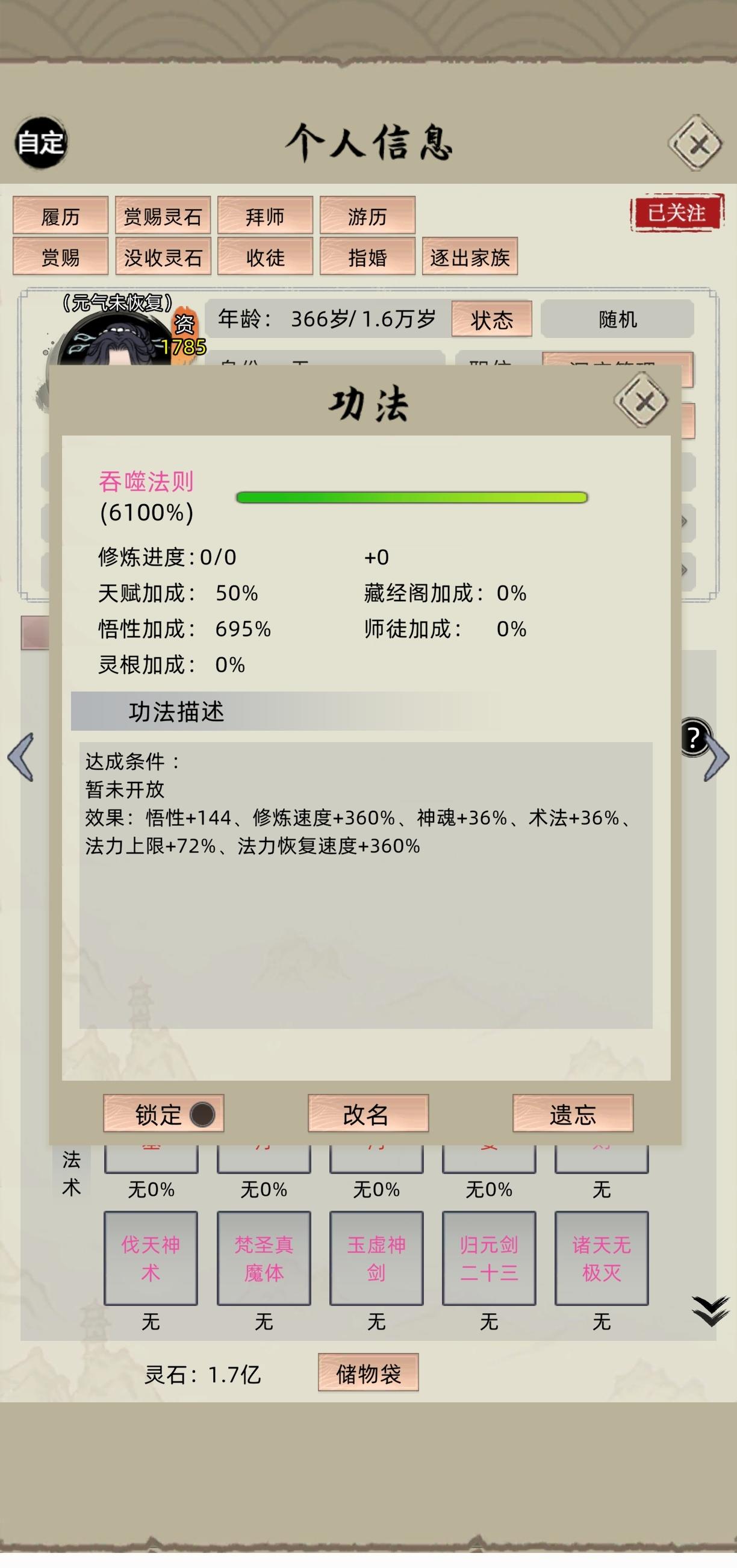 ③然后我的一个弟子400多资质的,我没有管它,它就自动有吞噬法则。另外一个1000多资质这样的弟子,我就想突破的时候不选择方向突破,而是随机Sl,因为电脑既然能有红色法则,也是根据随机的,前面有一次我有刷出过时间法则,那时候我还以为要把弟子放到电脑那边去才可以,但是是有时间长河的,这一次我就试着在自己这里突破,看能不能有,然后那个红色的轮回法则,是我删了四次出来的,两次魔之法则,一次死亡,一次吞噬,就是突破的时候,你不要给它指定突破法则,且资质高,满足条件,就能得到这种红色法则,可以直接在自己家族这里突破红色法则