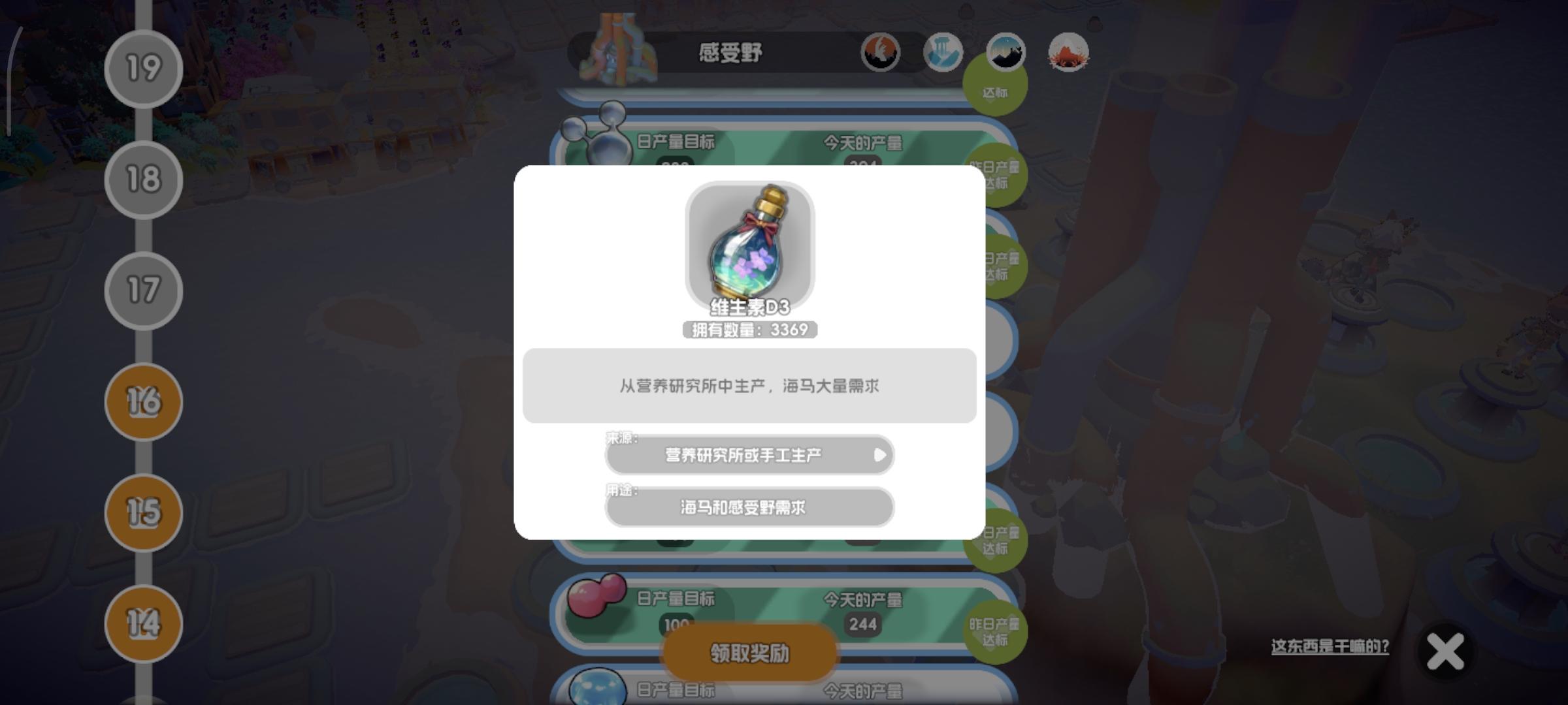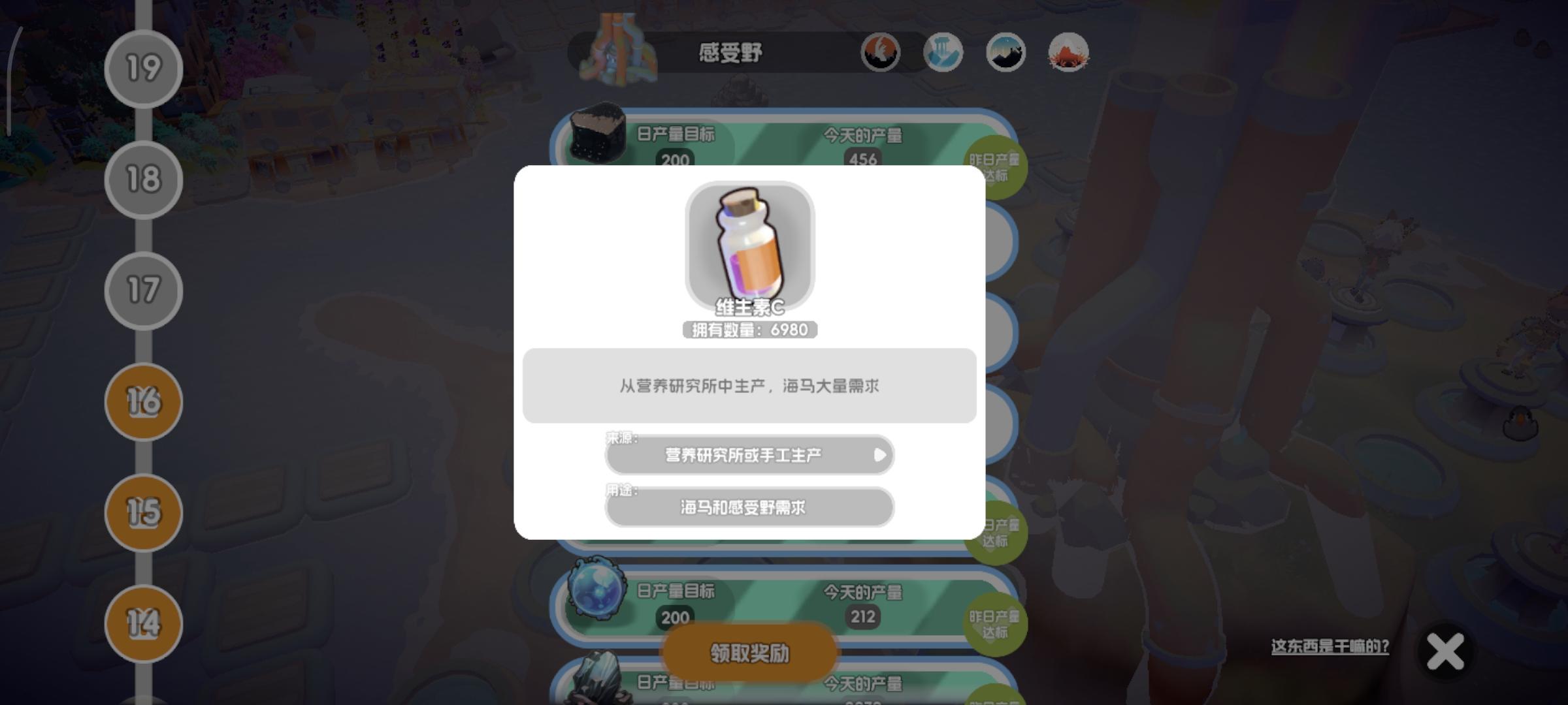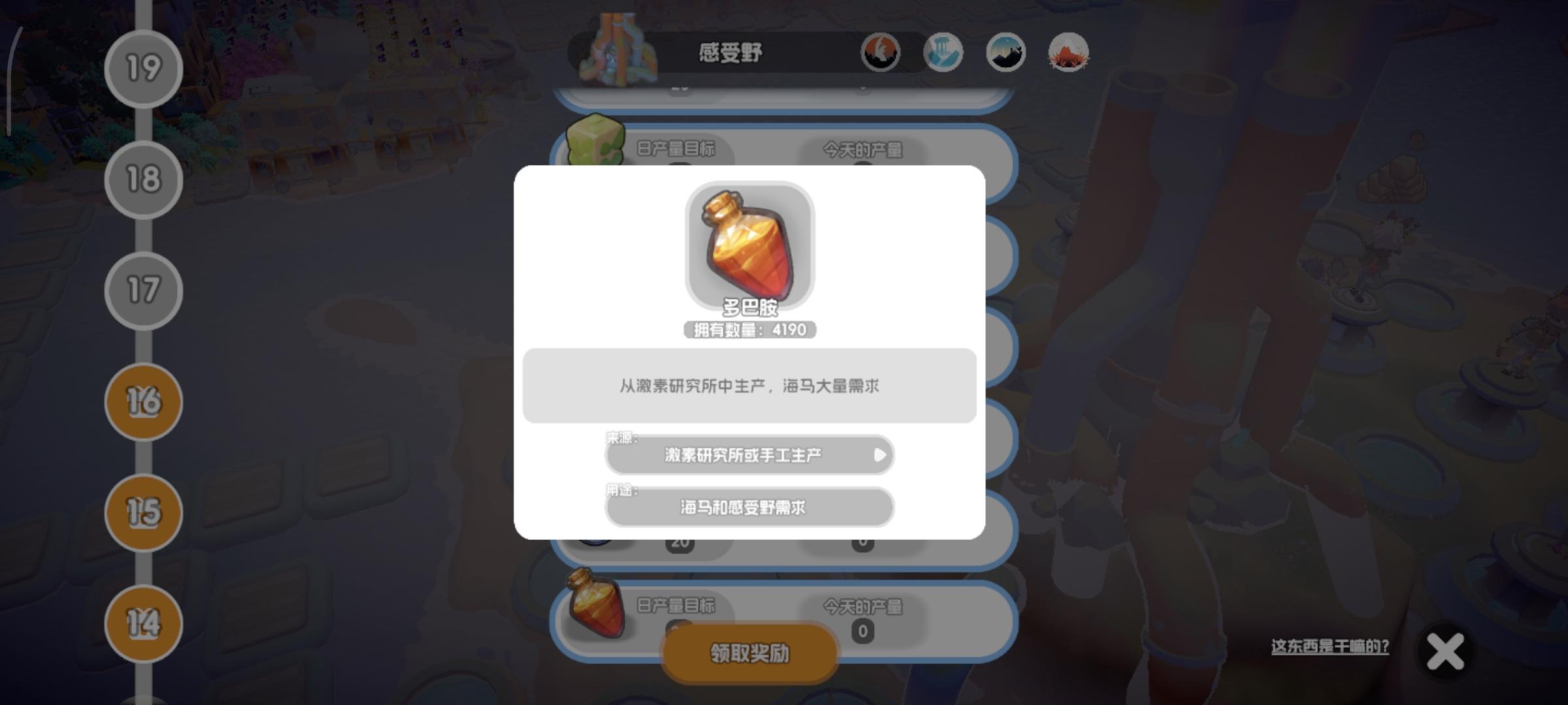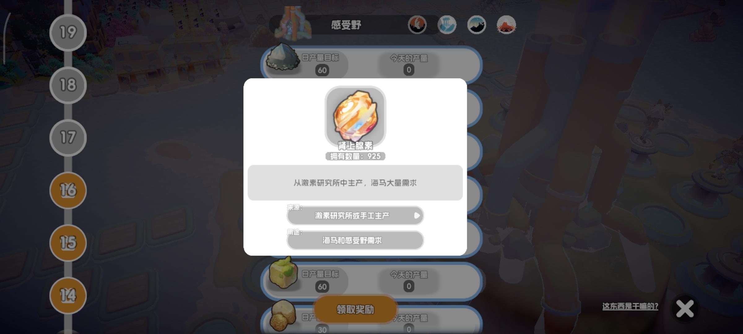 第三步就是查看自己的进度和机器等级来对应感受野的每日产量目标(每升一级生产建筑加50上限,如果你是一级就需要4个建筑哦)
