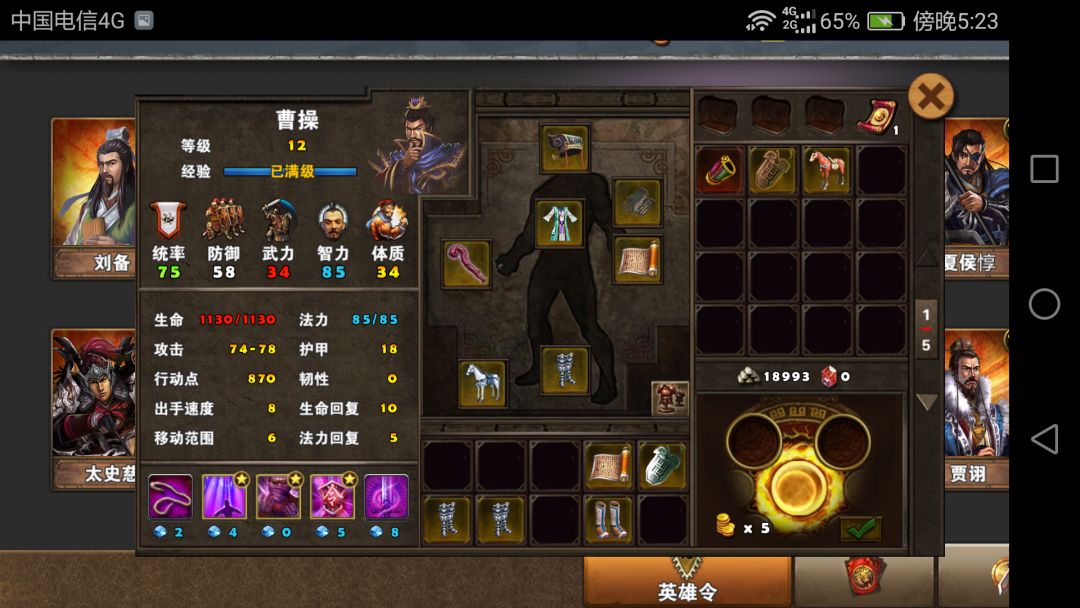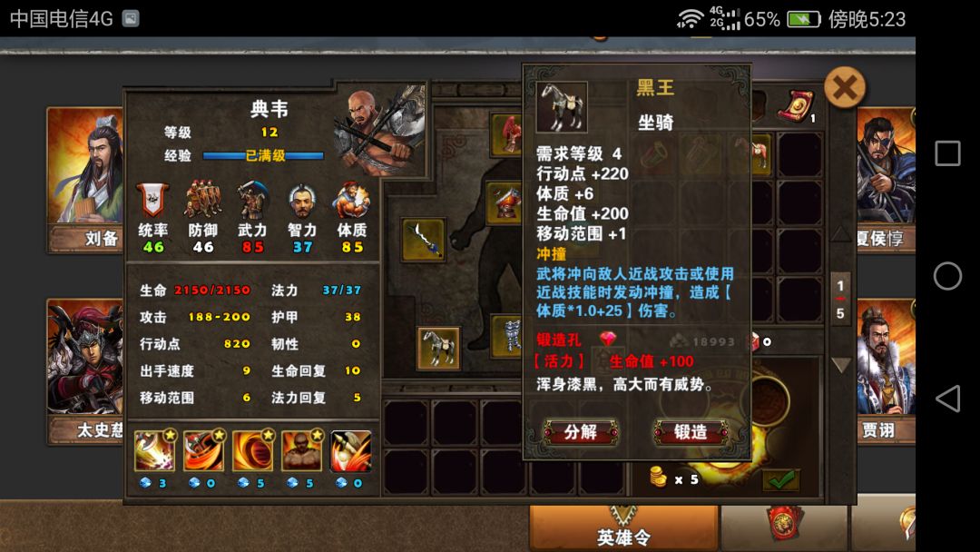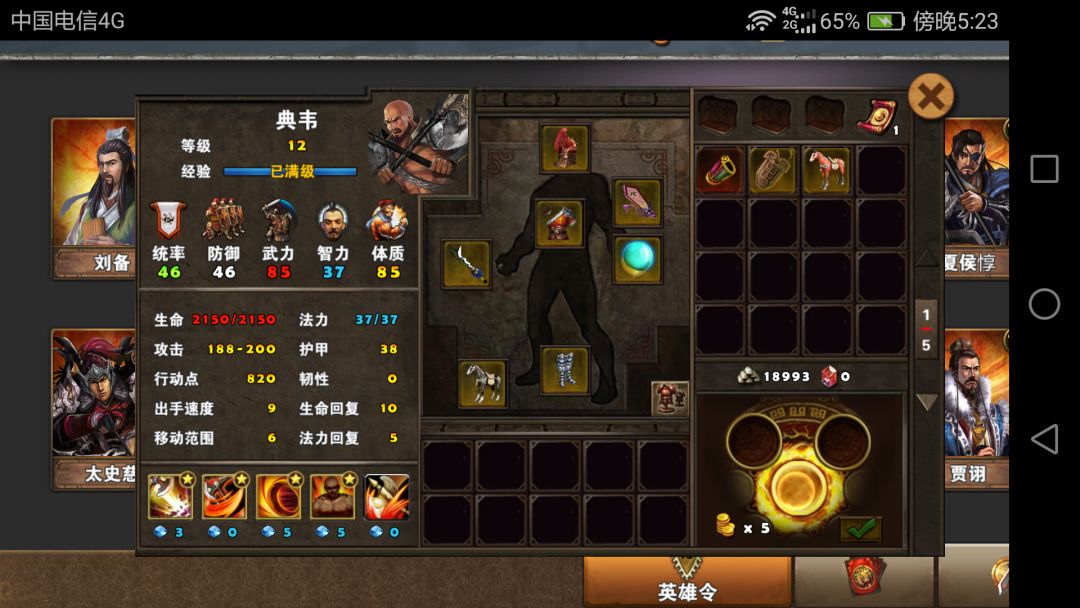 曹操沿用以前的刘备出装,宝物那里换了个六韬,统帅比较多更易于点亮曹操的大招。当然后面我还是没有点亮。典韦沿用之前关羽的装备,换了匹马,黑马。我挺喜欢的一件黄装,很可惜没有升级版本。