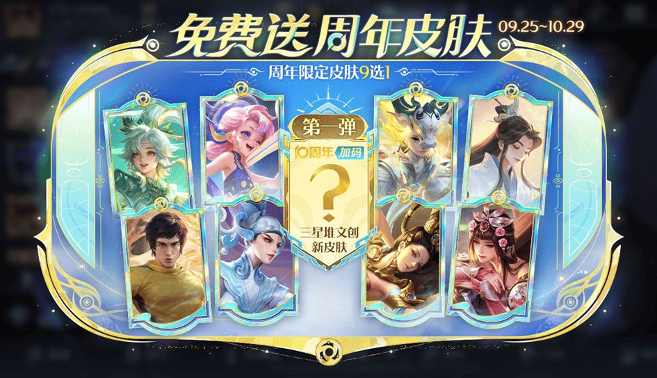 9月25日版本更新完成后就会开启周年皮肤免费送的活动,该活动一共有9款皮肤参与,2-9周年的主题皮肤,甄姬游园惊梦,杨玉环遇见飞天、梁祝上官婉儿、裴擒虎李小龙、庄周高山流水、鬼谷子五谷丰年、阿古朵江河有灵、桑启鸣野蒿,以及10周年的三星堆文创史诗皮肤。