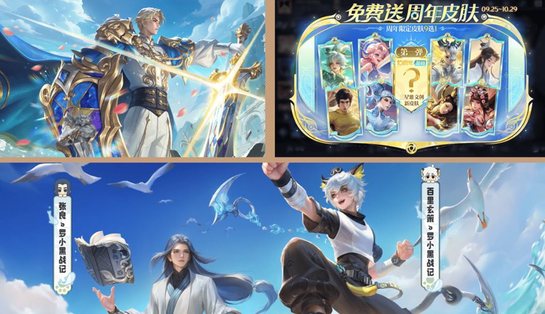 在免费皮肤这方面,新皮肤有亚瑟的S41赛季皮肤荣光之誓,2-10周年限定9选1中的10周年三星堆文创皮肤,以及百里玄策史诗的,张良勇者的罗小黑战记联动皮肤,前者联动的是罗小黑,后者联动的是无限。