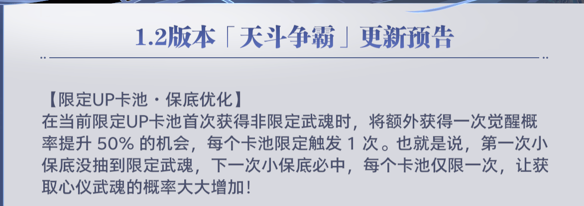 解读:限定UP卡池进行了保底优化,也就是当前限定卡池首次抽歪了,将额外获得一次觉醒概率提升50%的机会。这句话是什么意思呢?就是第一次卡池提示你有50%的机会抽中限定,但是你歪了,这个时候下一次就是100%,这个本来就是你必中的100%,当这个100%抽了以后,下一次又显示50%的时候,这个时候是必出限定,相当于3轮抽卡稳拿两个限定武魂,每个卡池只有一次小保底机会。(如果你有不明白的,欢迎到我Q粉丝群:812186068,攻略,吹牛,相互交流)。