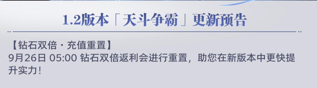 解读:最后在26号早上5点会重置钻石首充双倍,想氪金的兄弟们稳住,等时间到了再氪,这样又可以享受一次双倍快乐了。