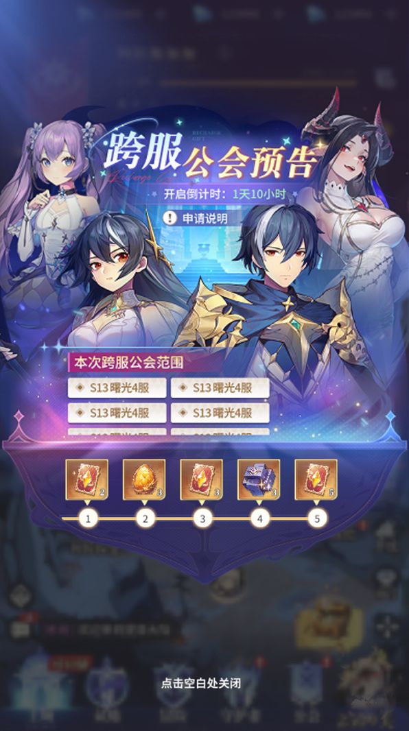 统开启后,处于相同跨服范围内的玩家,可以申请加入其他服务器的公会。(具体范围可游戏内查看,以游戏内的数据为准)