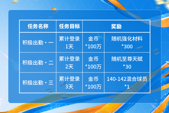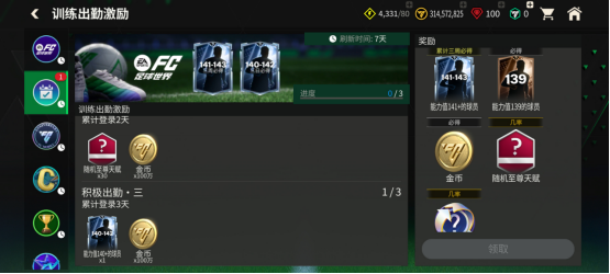 本周更新后,任务界面新增训练出勤激励,玩家每周登录游戏达到对应天数,可以获得奖励。每周累计登录3天,累计完成训练出勤激励三周,必得一名141-143能力值球员卡。